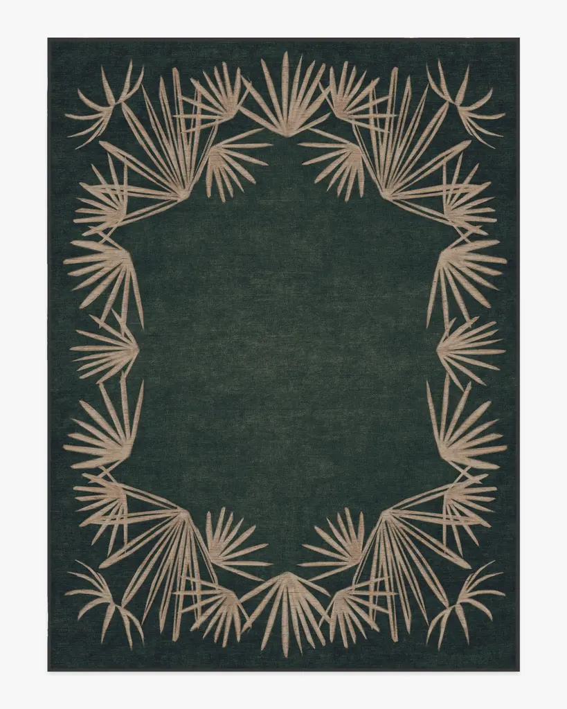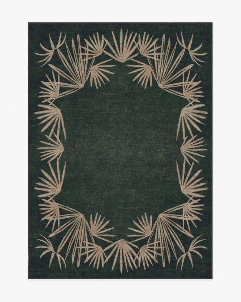 Beautiful. Breezy. Boho. Inspired by the swaying palm trees in Elysian Valley, Justina's former home, our Justina Blakeney Tarsila Forest Rug borrows artistic influence from Brazilian painter Tarsila de Aguiar do Amaral. The rich forest green background is surrounded by natural, warm palm motifs that bring serenity and style to any space. Water-resistant, stain-resistant, and machine-washable. Rug colors may vary slightly according to your device and the lighting in your space.