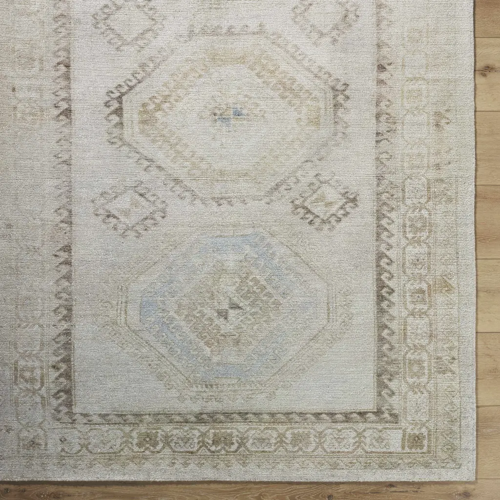 Collection: Tarun Colors: Ivory, Sandstone, Sky Blue, Taupe, Beige Construction: Hand Tufted Material: 100% Polyester Pile: Low Pile Pile Height: 0.2" Styles: Transitional,Traditional Backing: Canvas Made In: India Thickness: 0.28" Price Range: $$$$$ (Affordable)