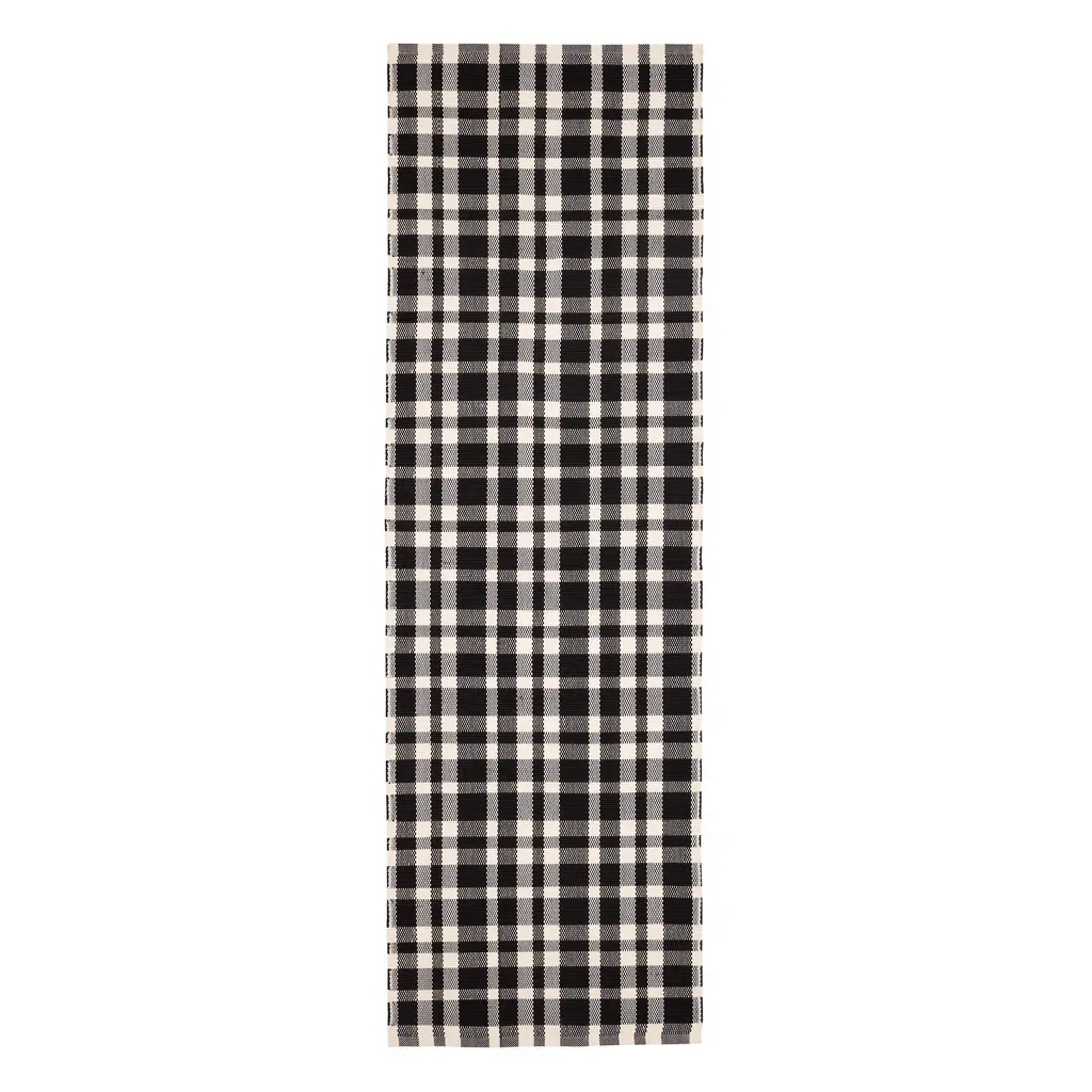 Add a touch of classic style to your high-traffic spaces with this lightweight, washable, and durable indoor/outdoor rug in a timeless yet modern black and ivory plaid.