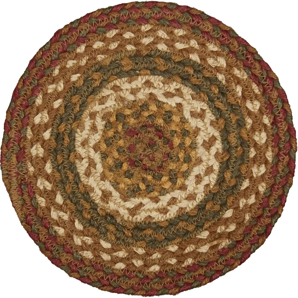 The Tea Cabin Jute Trivet beautifully adorns the rustic table with alternating braids of crimson, moss green, sage green, and creme.Features PREMIUM CONSTRUCTION: with over two decades experience crafting goods for American homes, our items are built to last for years to come.RUSTIC DECOR: cabin style to fit any lodge, cabin, lake house, or retreat.QUALITY MATERIAL: made with durable 100% jute for a proper look and feel.Alternating braids of crimson, moss green, sage green, and cremeBraided: Machine braided, Machine stitchedSpecifications Material: 100% JuteDimensions: 8" diameterWeight: 0.1 lbColors: Moss Green, Crimson, CremeManufacturer Country: IndiaCare: Spot Clean* To prevent colors from bleeding do not use chemicals or wet clean this item. A rug pad is recommended to keep your surfaces safe from color bleeding and abrasiveness of the jute fibers.