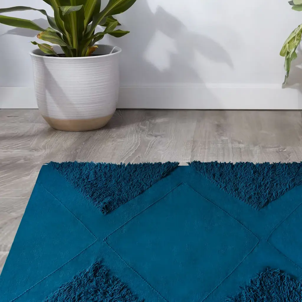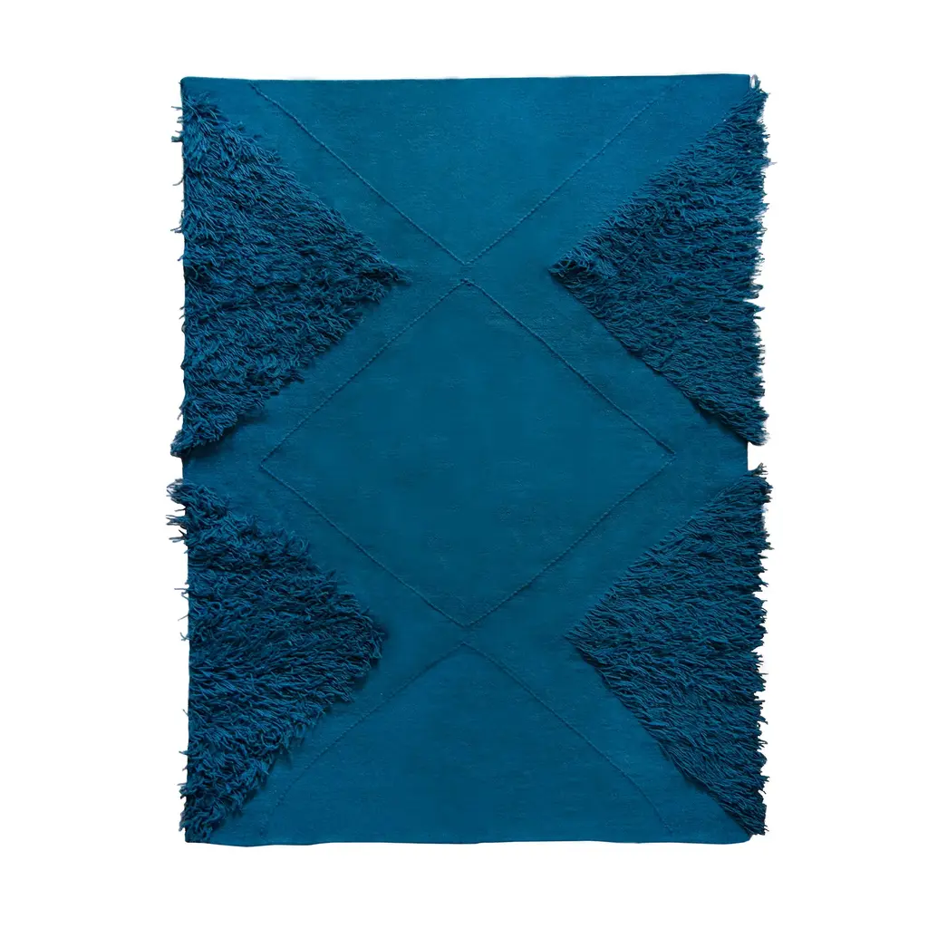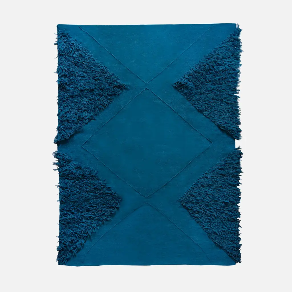 Add depth and texture to a room with this blue rug, a luxurious hand tufted wool rug crafted in Fowwa, Egypt. Made from premium wool, this tufted rug features symmetrical patterns and a plush feel underfoot. Rich teal navy blue area rug tones blend seamlessly with tufted fringes, creating a striking teal and blue rug that complements modern, boho, or mid century styles. Perfect as a rug for bedroom, living room, or hallway, it offers durability and softness in equal measure. This sustainable blue wool rug brings artisan craftsmanship into everyday living., Living room: use as a bold blue area rug to anchor modern decor., Bedroom: use as a soft teal wool rug for cozy comfort. , Hallway: Durable blue wool rug for everyday use.