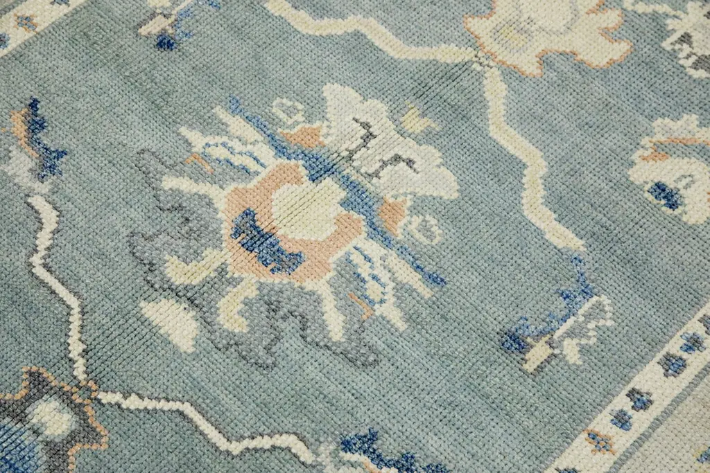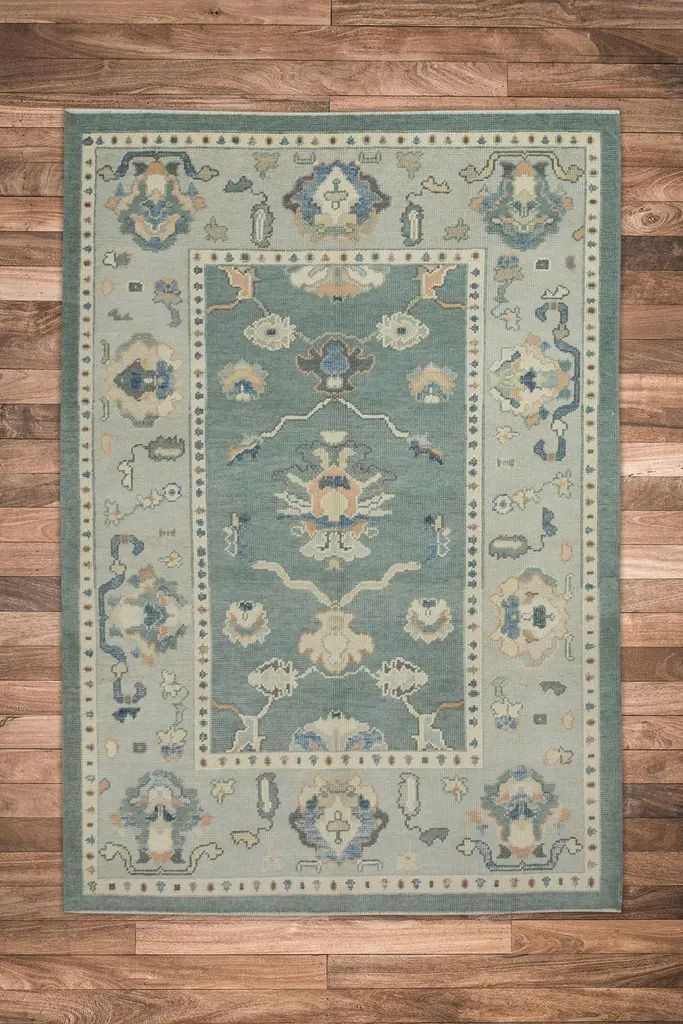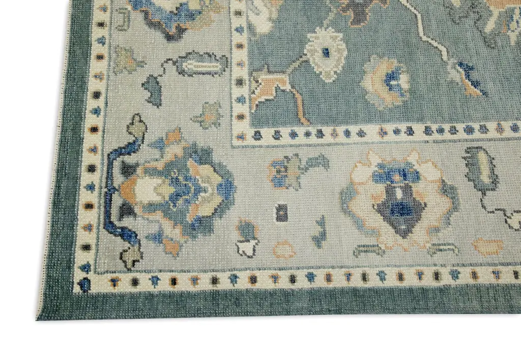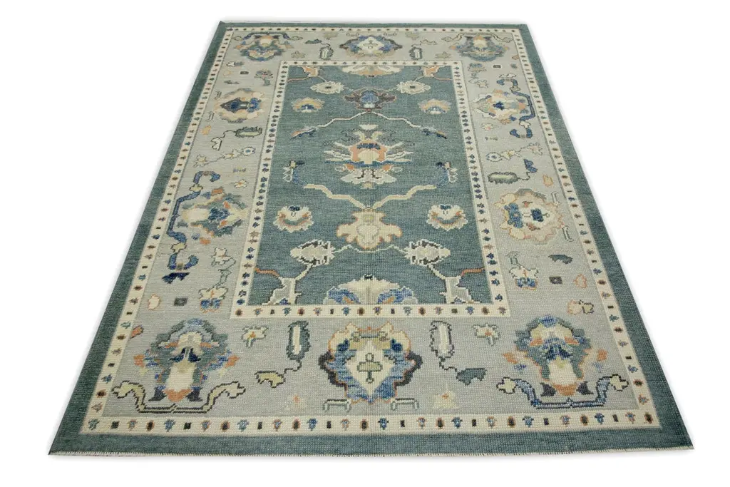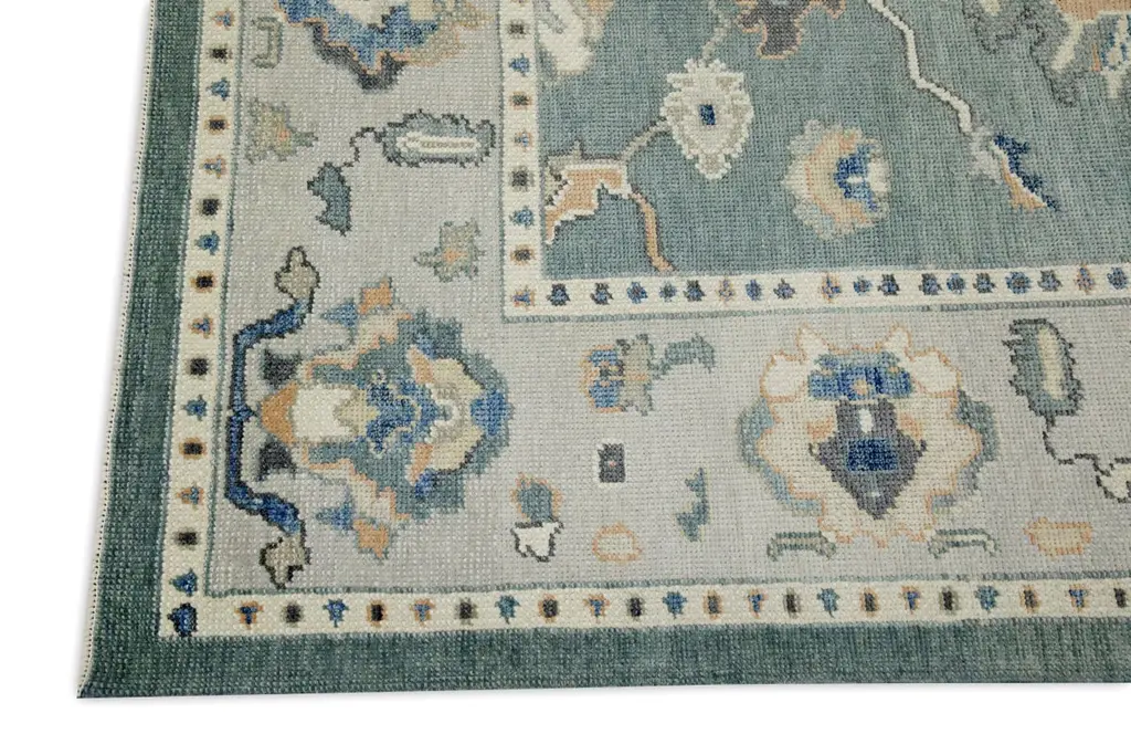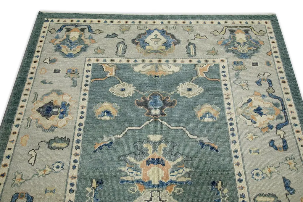 Teal Floral Design Handwoven Wool Turkish Oushak Rug 5'3" X 7'2"