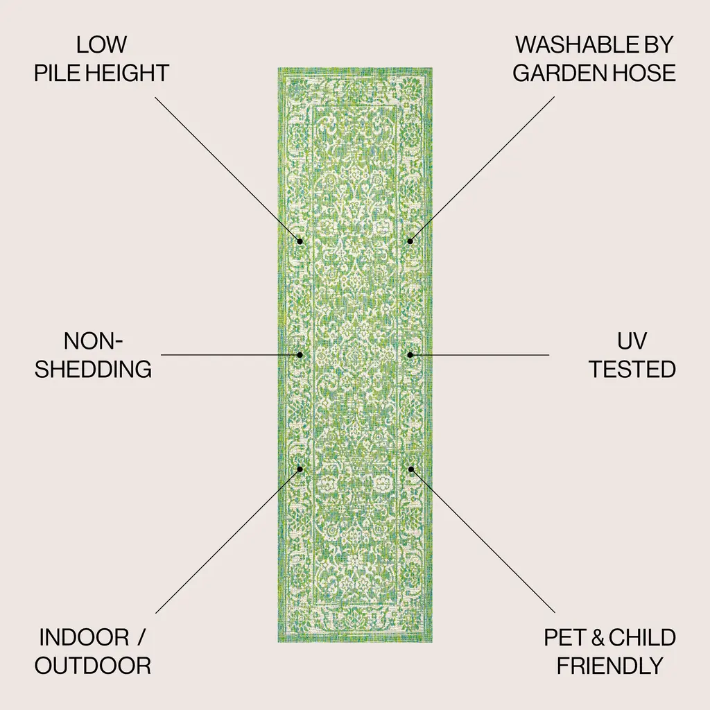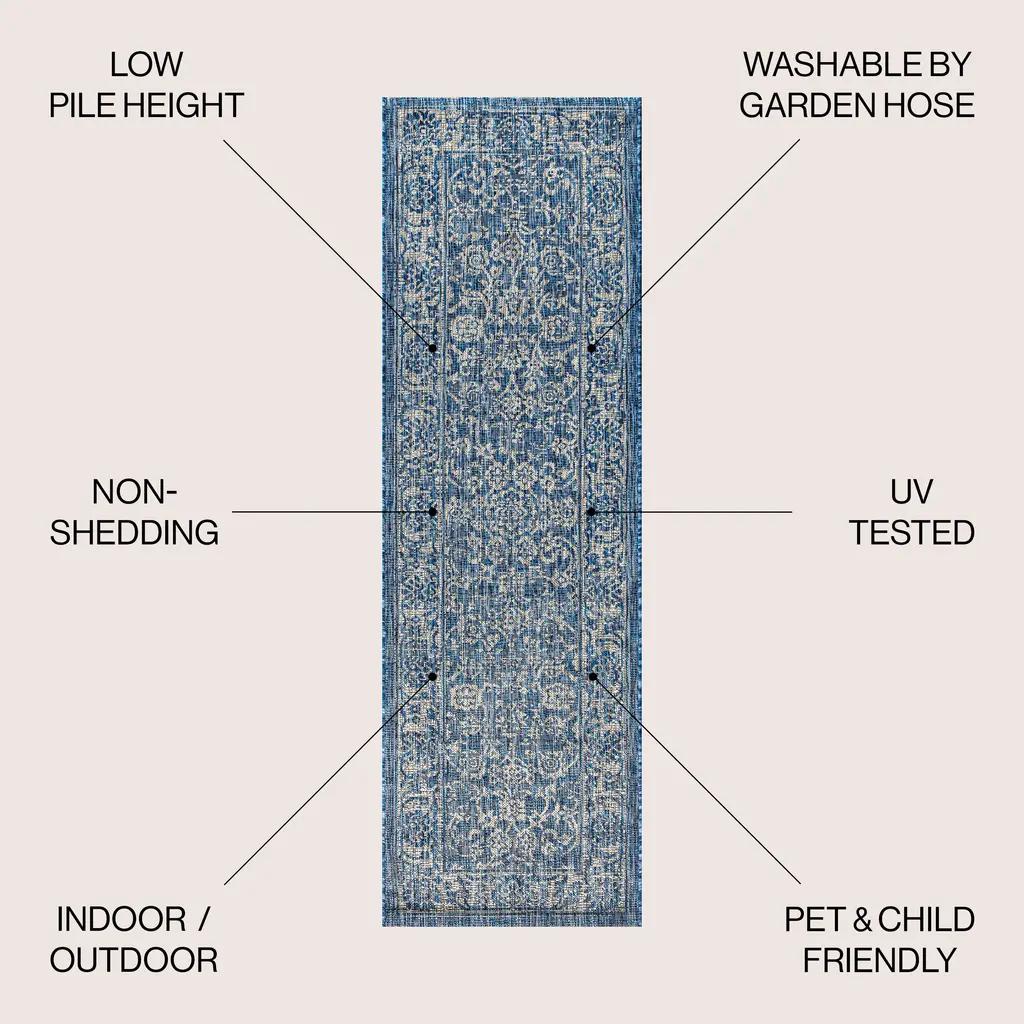 With a vine-and-border design inspired by Persian rugs, our Boho-chic rug adds eclectic style to an outdoor porch or patio. Varied tones of blue and navy mingled with a light gray pattern give this rug a hand-woven, vintage vibe. The flatweave design is great for high-traffic spaces indoors too.