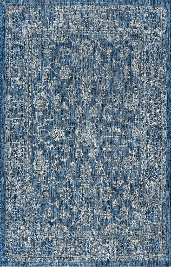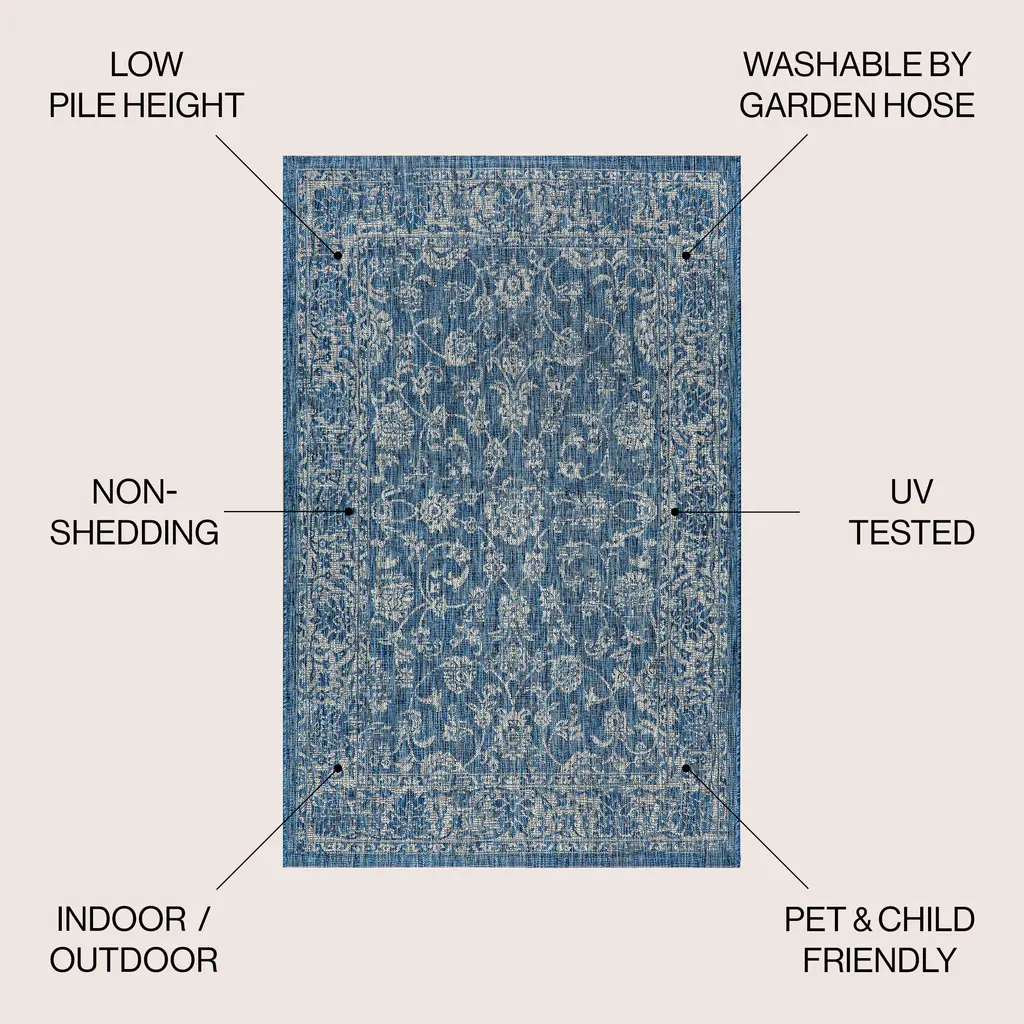 With a vine-and-border design inspired by Persian rugs, our Boho-chic rug adds eclectic style to an outdoor porch or patio. Varied tones of blue and navy mingled with a light gray pattern give this rug a hand-woven, vintage vibe. The flatweave design is great for high-traffic spaces indoors too.