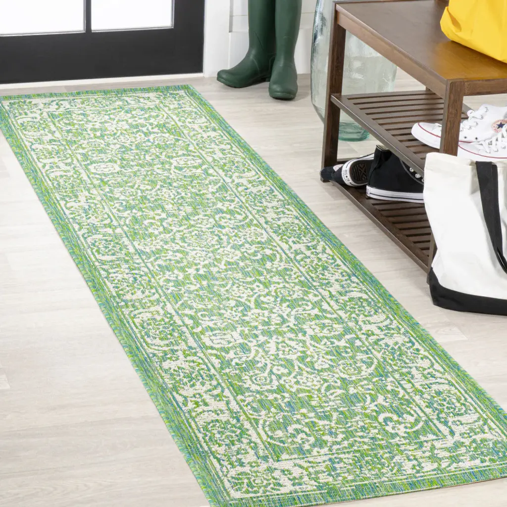 With a vine-and-border design inspired by Persian rugs, our Boho-chic rug adds eclectic style to an outdoor porch or patio. Varied tones of green mingled with a taupe pattern give this rug a hand-woven, vintage vibe. The flatweave design is great for high-traffic spaces indoors too.Features:• Water resistance with 0.19" pile• Green and taupe with a handwoven mingled texture• Flat-weave construction of 100% polypropylene• 100% Polypropylene• No backing, use of rug pad is recommended (sold separately)• Power Loomed in Turkey• Actual Dimension: 2 ft. 2 in. X 10 ft.• Color: Cream/Green• Thickness measures: 0.19 in.• Available in multiple sizes and/or colorsRug Care:• Vacuum regularly and spot clean as needed; avoid direct and continuous exposure to sunlight; use brushless vacuum; remove spills immediately; if liquid, blot with clean, undyed cloth by pressing firmly around the spill to absorb as much as possible; for hard to remove stains, professional rug cleaning is recommended; store in a dry, well ventilated area and rotate for consistent wear• Packing and shipping may cause temporary creases in rugs, which will flatten out after a week on the floor; to expedite the process, try back-rolling your rug before laying it down, and then allow ample time for the remaining creases to relax• Please Note: Due to differences in monitors, some rug colors may vary slightly. Lengths and widths may vary from the published dimensions. Patterns may vary slightly according to shape and size selected.About us:Style your floors with JONATHAN Y. By combining fine craftsmanship and design, this New York creative studio is bringing fashion to your floors. The collection mixes sustainable organic materials, vibrant colors and trend worthy styles to create JONATHAN Y''s distinctive catalog of rugs.
