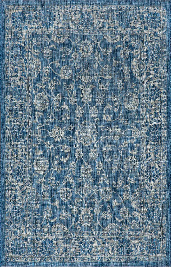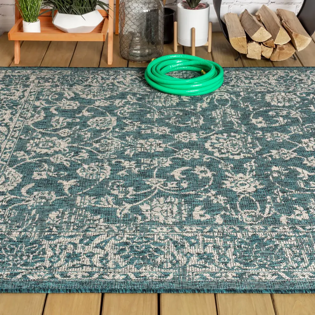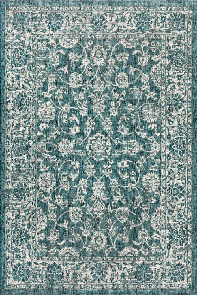 With a vine-and-border design inspired by Persian rugs, our Boho-chic rug adds eclectic style to an outdoor porch or patio. Varied tones of teal and deep blue mingled with a gray pattern give this rug a hand-woven, vintage vibe. The flatweave design is great for high-traffic spaces indoors too.Features:• Flat-weave construction of 100% polypropylene• Deep blue and teal mingled with gray for a handwoven texture• Water resistance with 0.19" pile• 100% Polypropylene• No backing, use of rug pad is recommended (sold separately)• Power-loomed in Turkey• Actual Dimension: 9 ft. x 12 ft.• Color: Teal/Gray• Thickness measures: 0.19 in.• Available in multiple sizes and/or colorsRug Care:• Vacuum regularly and spot clean as needed; avoid direct and continuous exposure to sunlight; use brushless vacuum; remove spills immediately; if liquid, blot with clean, undyed cloth by pressing firmly around the spill to absorb as much as possible; for hard to remove stains, professional rug cleaning is recommended; store in a dry, well-ventilated area and rotate for consistent wear• Packing and shipping may cause temporary creases in rugs, which will flatten out after a week on the floor; to expedite the process, try back-rolling your rug before laying it down, and then allow ample time for the remaining creases to relax• Please Note: Due to differences in monitors, some rug colors may vary slightly. Lengths and widths may vary from the published dimensions. Patterns may vary slightly according to the shape and size selected.About us:Style your floors with JONATHAN Y. By combining fine craftsmanship and design, this New York creative studio is bringing fashion to your floors. The collection mixes sustainable organic materials, vibrant colors and trend-worthy styles to create JONATHAN Y''s distinctive catalog of rugs.