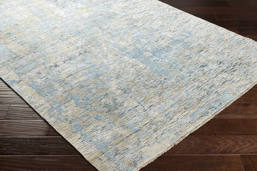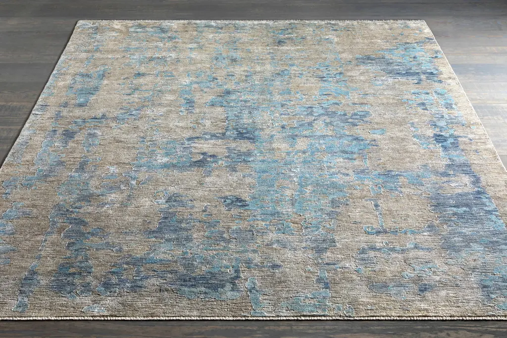 Collection: Temora Colors: Taupe, Blue, IceBlue, LightGray Construction: Hand Knotted Material: 40% Viscose,60% NZWool Pile: Low Pile Pile Height: 0.15" Styles: Contemporary Made In: India Thickness: 0.15" Fringe Length: 0.5" Price Range: $$$$$ (Premium)