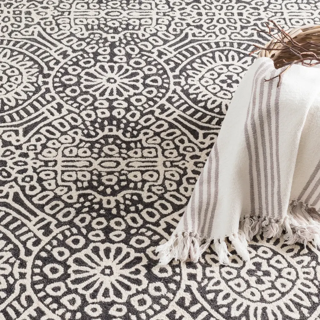 Build a cozy and welcoming sanctuary with this micro-hooked wool rug. Featuring a pattern reminiscent of leaded glass on a charcoal background, this area rug brings an aura of serenity and spirit to any space it inhabits.