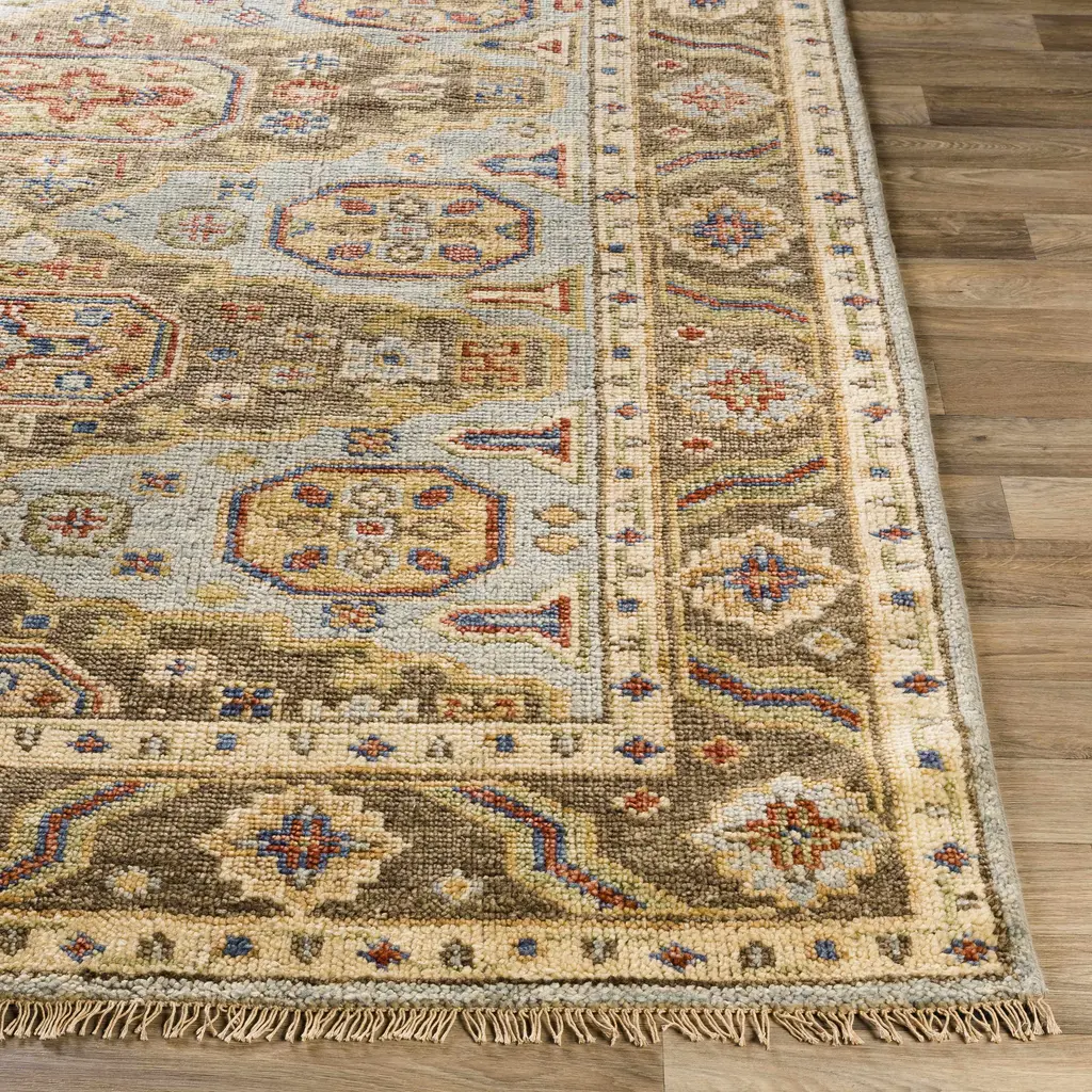 Collection: Temvik Colors: Aqua, Blue, Ivory, Olive, Brick Red, Yellow, Lime Green Construction: Hand Knotted Material: 100% NZ Wool Pile: Low Pile Pile Height: 0.19" Styles: Bohemian/Global Made In: India Thickness: 0.24" Fringe Length: 1" Price Range: $$$$$ (Premium)