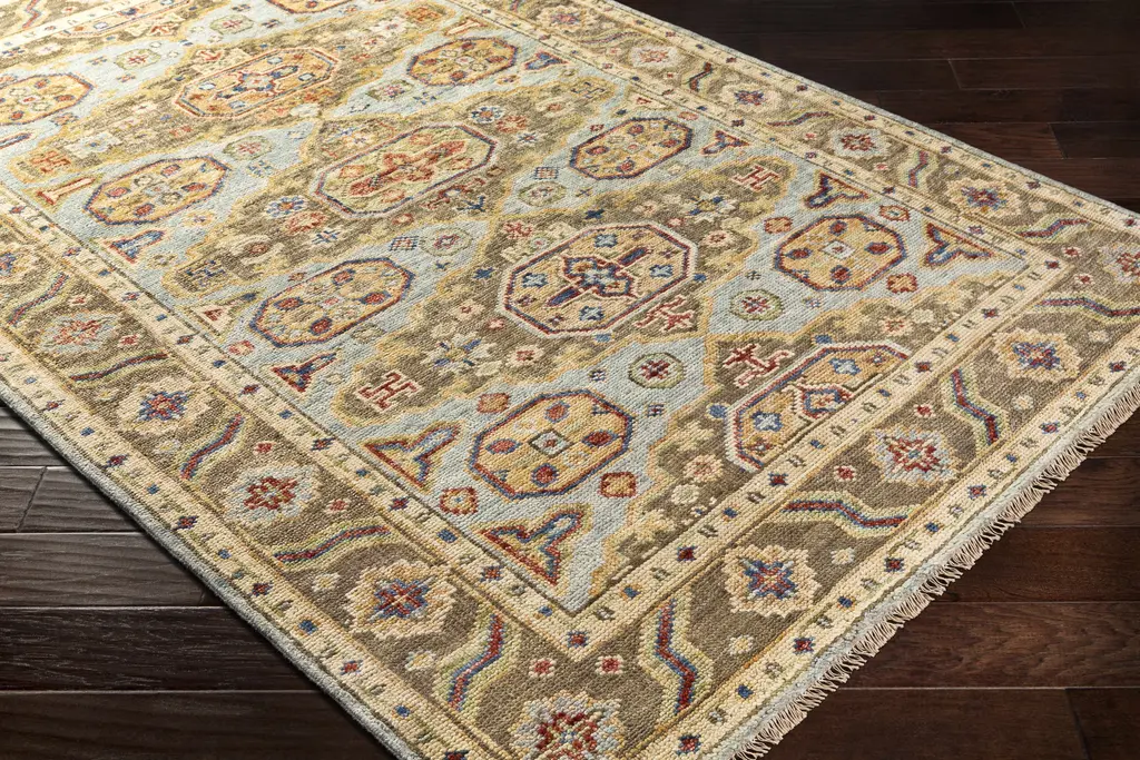 Collection: Temvik Colors: Aqua, Blue, Ivory, Olive, Brick Red, Yellow, Lime Green Construction: Hand Knotted Material: 100% NZ Wool Pile: Low Pile Pile Height: 0.19" Styles: Bohemian/Global Made In: India Thickness: 0.24" Fringe Length: 1" Price Range: $$$$$ (Premium)