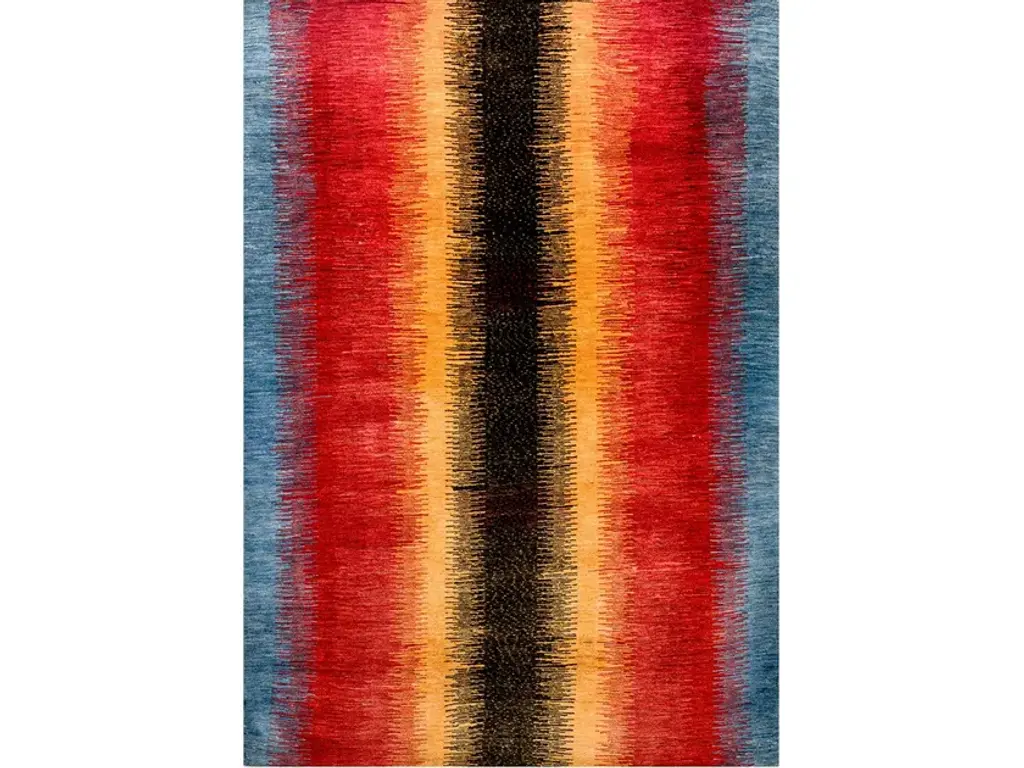 'Tenebrist' Chevrons is a rectangular wool rug.Zollanvari ‘minimalist’ kilims are diverse. Baneh kilims are woven in northern regions in sections using natural undyed wools and then skilfully stitched together. The one-piece Zagros kilims woven by the Luri and Ghashgha’i nomads are monochromatic. They have traditional ‘lazy lines’ that form subtle patterns of diamonds and squares. Maryam kilims, woven by the same tribes, have plain ground colours with repeat motifs hand-embroidered in pure silk, awarded Best Innovation at the CDAs in 2009. The jewel in the crown of our ‘minimalist’ flatweaves is a collection that draws inspiration from the old and antique Mazandaran kilims that have appeared on the market in the past decade – a truly modern collection. Caprino is a new flatweave collection woven from undyed goat’s hair on which pile-knotted erratic modernist lines in bright colours are superimposed.