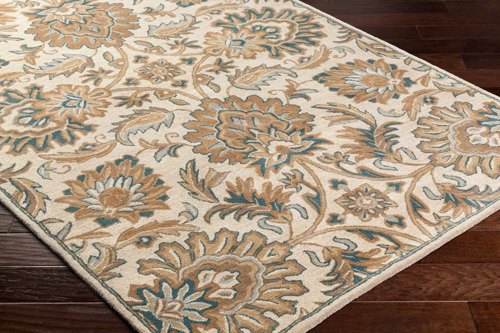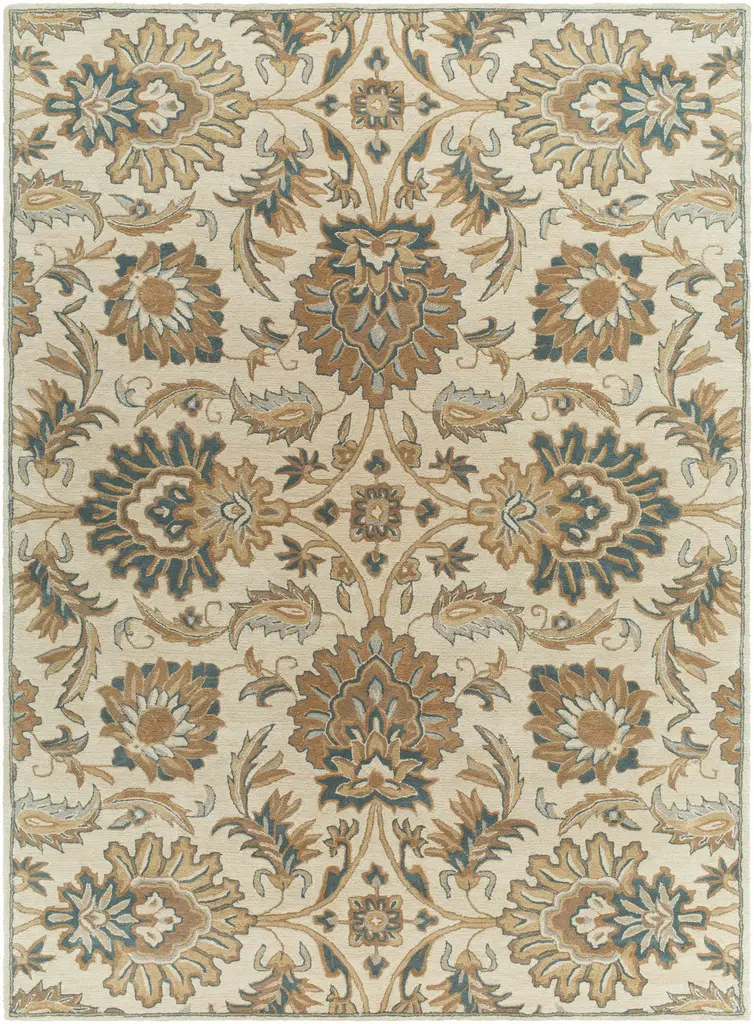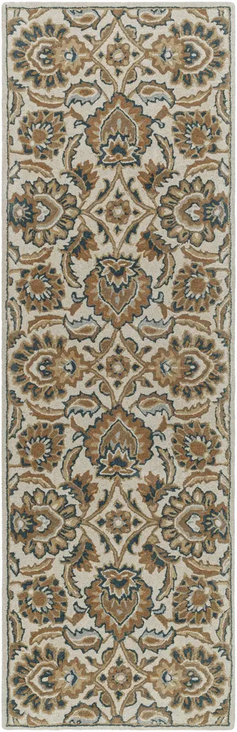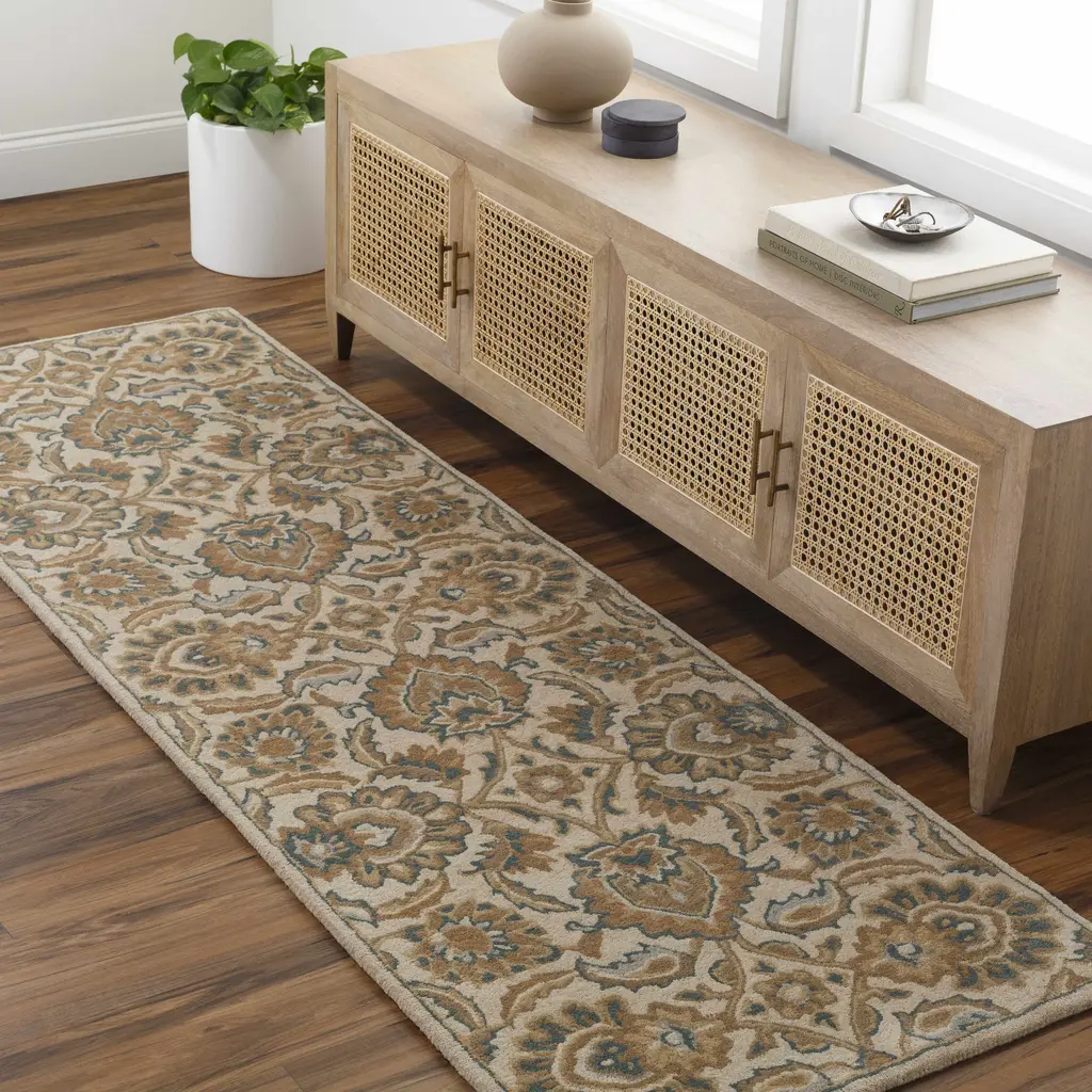Collection: Teom Colors: Tan, Medium Gray, Beige, Camel, Dark Brown Construction: Hand Tufted Material: 100% Wool Pile: Medium Pile Pile Height: 0.39" Styles: Traditional Backing: Canvas Made In: India Thickness: 0.87" Price Range: $$$$$ (Affordable)