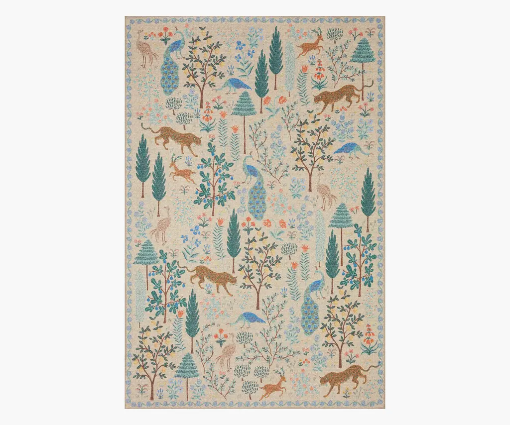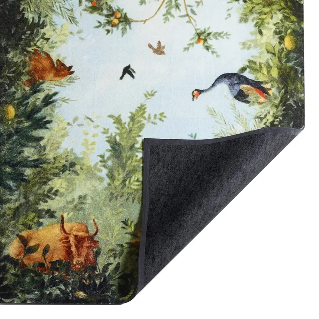 A blooming forest contrasts with a clear sky, with lions and cheetahs, bisons and antelopes that populate it. The Terra carpet designed by Marcantonio gives us the image of a quiet nature where the most diverse species coexist in total harmony. Our perspective is from below, as if the top were there at our feet, and we are equally fascinated by the quiet and relaxed atmosphere although our point of view is far away. The Terra carpet and its Cielo variant represent, in the intentions of the designer, the starting point where to investigate our deep and eternal bond with nature. A natural environment that in fact is deliberately depicted in the typical manner of the Renaissance frescoes, an age in which, for the first time, nature is conceived as a living whole, intimately linked with man. Available in two sizes, Terra is the perfect rug for anyone who believes the relaxing power of nature. Made of synthetic fibre, it has a webbing edge and a felt back which protects the surfaces and guarantees maximum stability.Techinical data Four-colours printed synthetic fibre carpet representing a natural environment populated by wild animals. Felt backing and webbing edges. Available in two rectangular sizes. Notes: home and contract use. Fireproof and anti-slip. Good sound insulation.