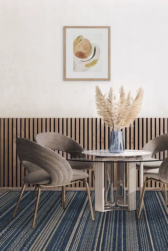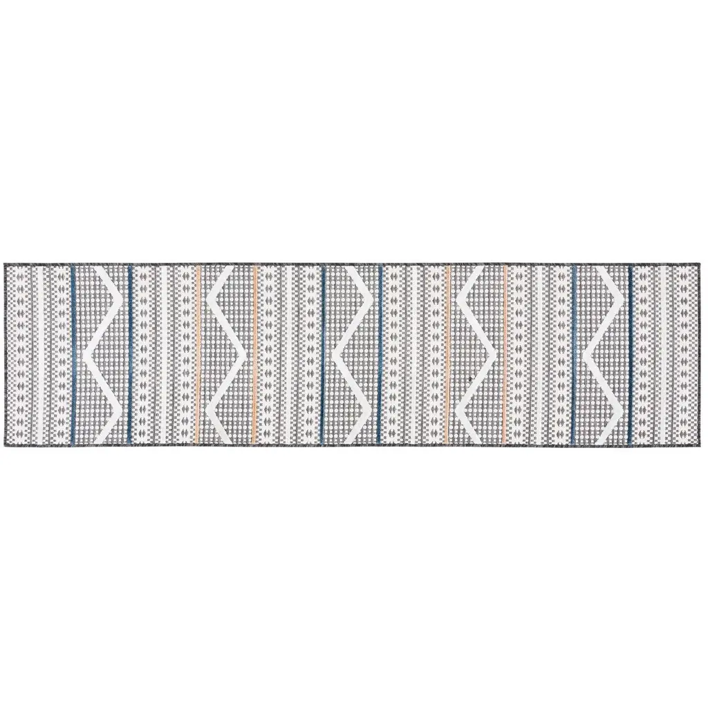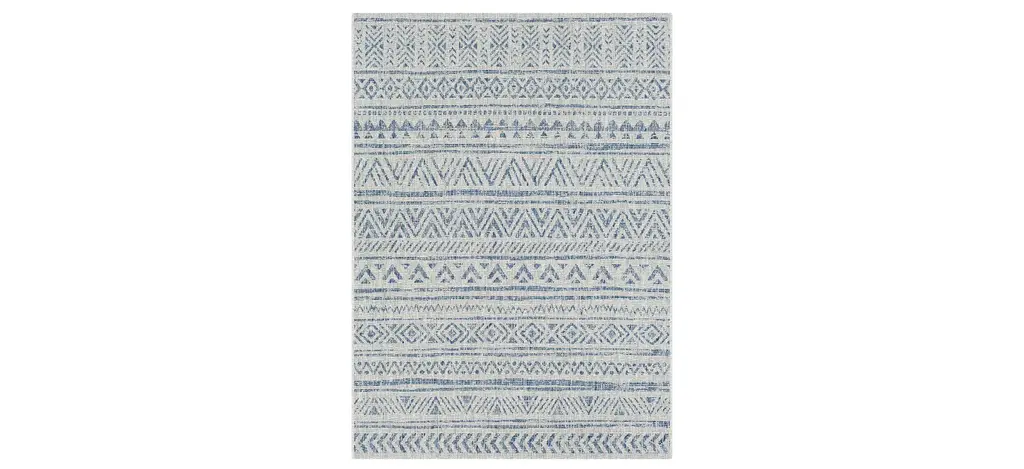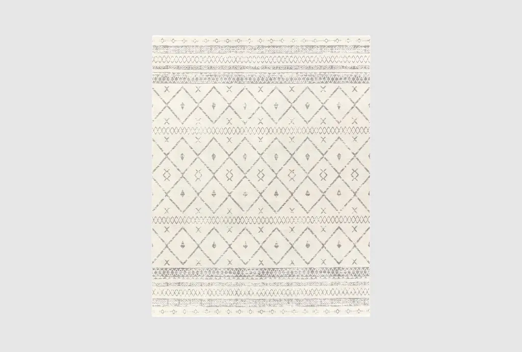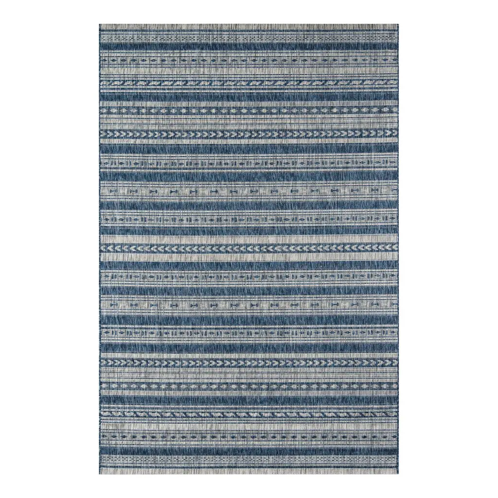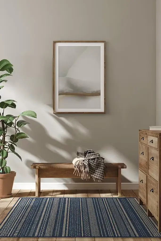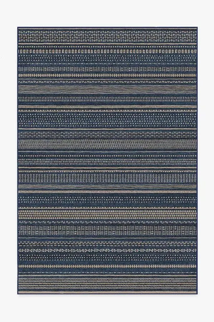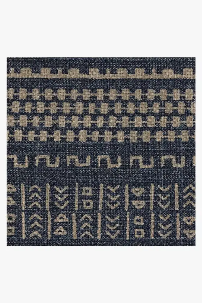 Stunning stripes that make a statement. This rug features various patterns in black to create a striped effect. Its natural tan color and woven texture give it a jute-like appearance that's easily washable. Made with recycled + virgin polyester, and polyurethane.