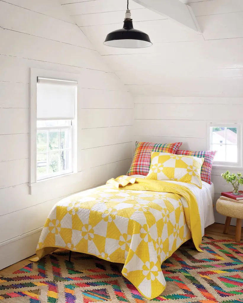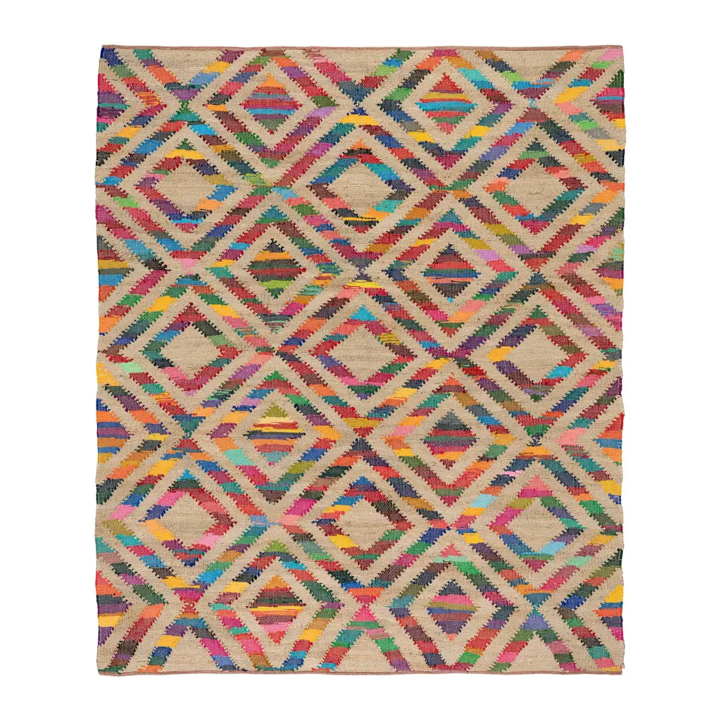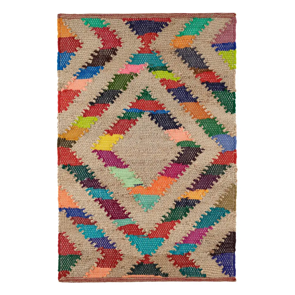 As radiant as a stained glass window, strips of cutting room scraps get a second chance to shine as they weave through a natural jute ground. Each handwoven rug has a unique placement of rainbow colors in a bold geometric pattern, enhancing its beauty. Guaranteed to light up your floor, this sustainably produced cotton, and jute rug ticks all the boxes.