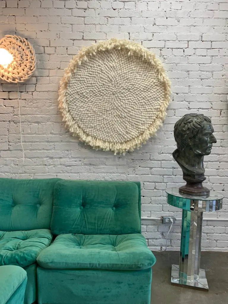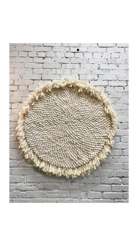 Part of the permanent collection of the Museum of Masters and Craftsmen of Quebec in Montreal, this luxuriously soft piece is handmade by Annie Legault in her Old Montreal studio. Referring to the rag rug, this piece pays homage to the work of women of the time, and with the mission of preserving knowledge of ancient textile techniques, Annie Legault highlights the noble and respected manual work of women by using the pure and soft merino wool as a metaphor. The timeless wall rug brings a touch of modernity to this piece that will bring warmth to your space. Easy to install, the artwork comes with a very light half-circle metal frame for hanging.