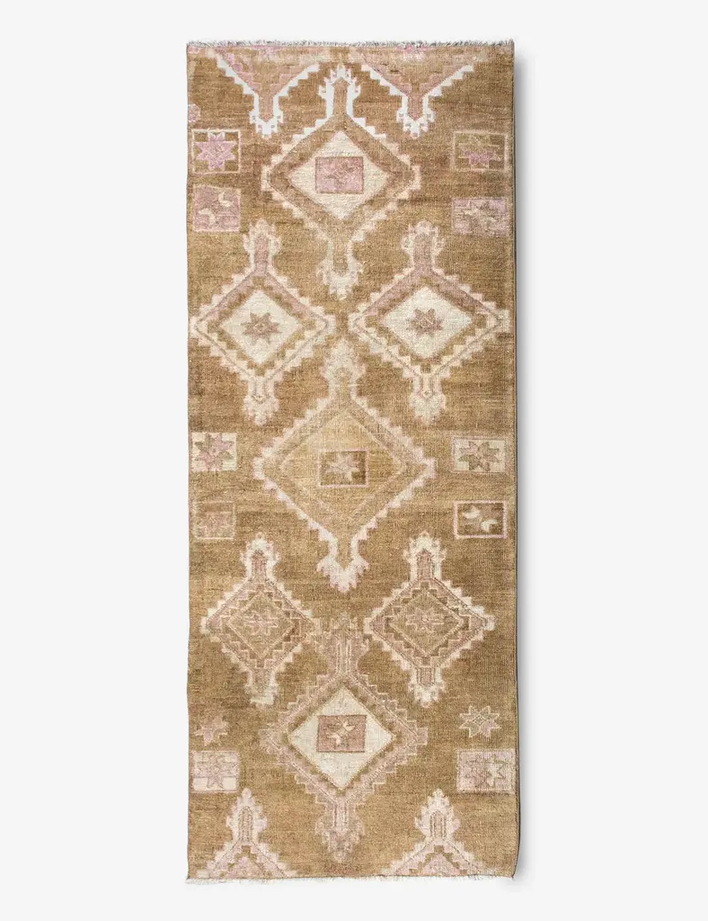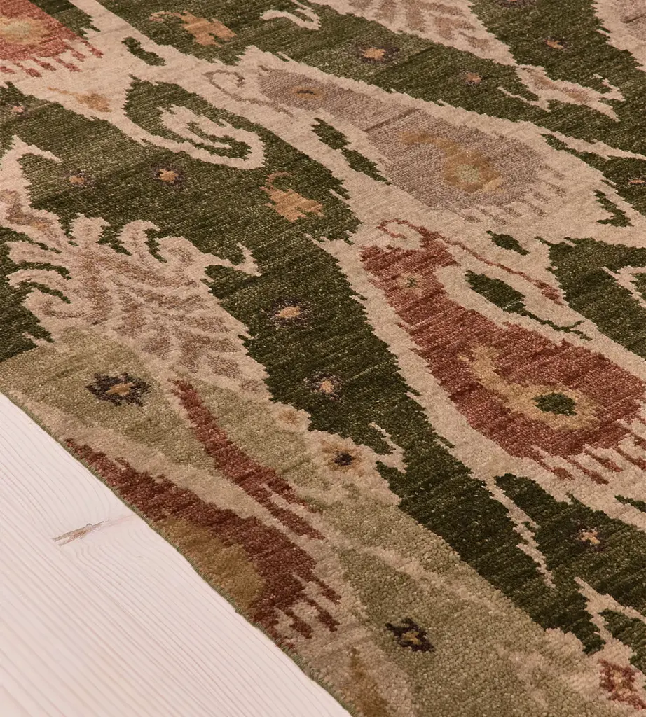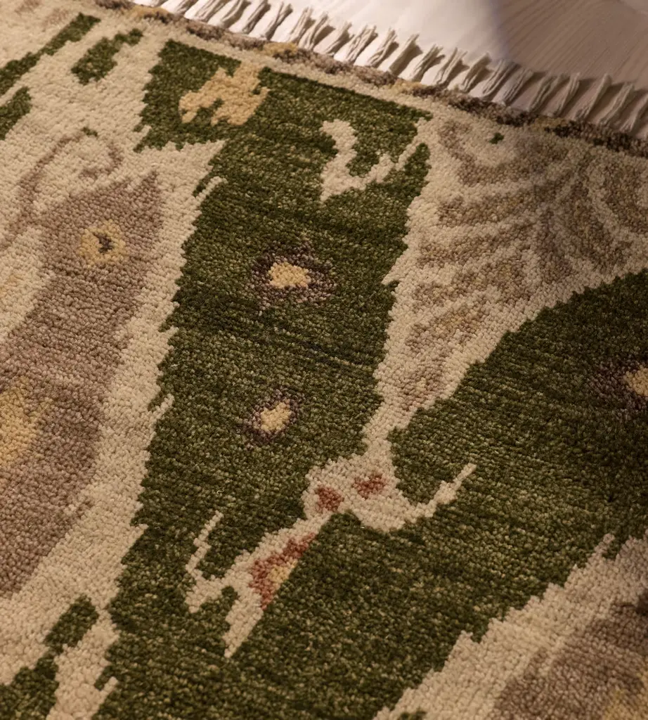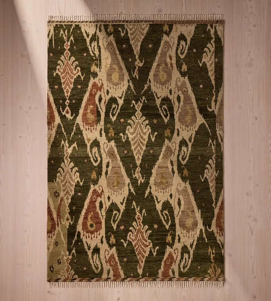 Hand-knotted wool creates an abstract pattern in warm, natural tones. The hand-knotted pattern of our Thayer rug takes inspiration from the abstract elements in the traditional woven ikats seen throughout the bedrooms of Soho Farmhouse.