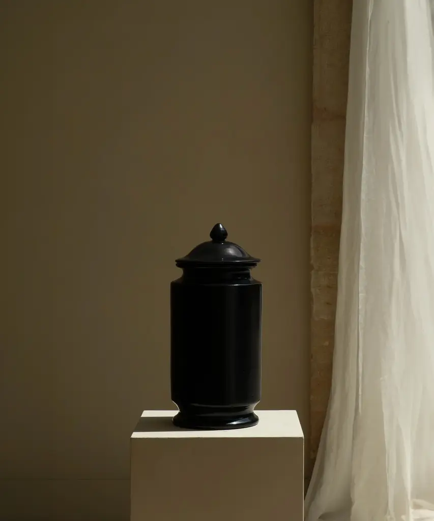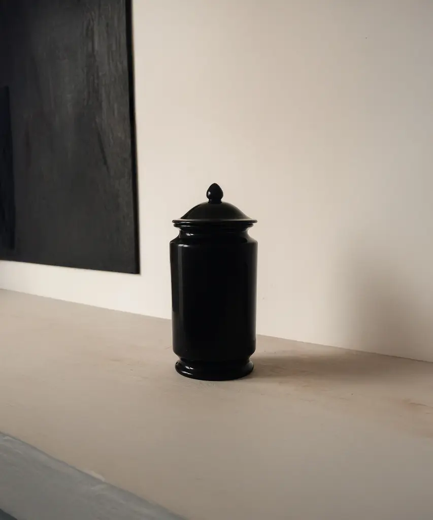 The Albarello is inspired by medicinal jars used to hold apothecaries’ ointments and dry drugs. Its shape made it easier to store on apothecary shelves. The ceramic is handthrown and the orignal decor has been blacked out. The shiny black glaze has been rubbed by hand by the artisans to give this matte finish.