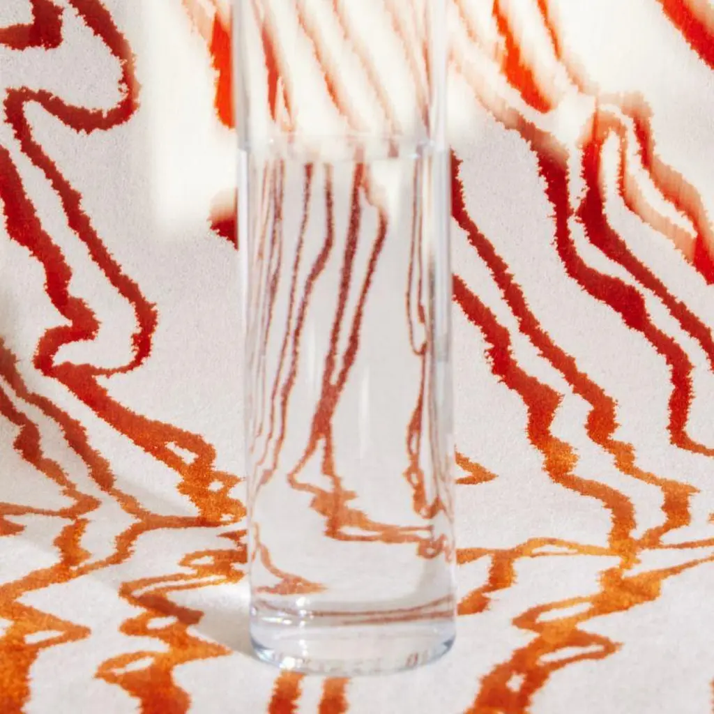 This intriguing rug from "The Floor Is Lava" Collection showcases warped lines melting like lava flows. Its eye-catching, angled white silhouette and red lines are obtained by hand-tufting New Zealand wool and Tencel lyocell together. Please inquire for available customization options and detailed care instructions.