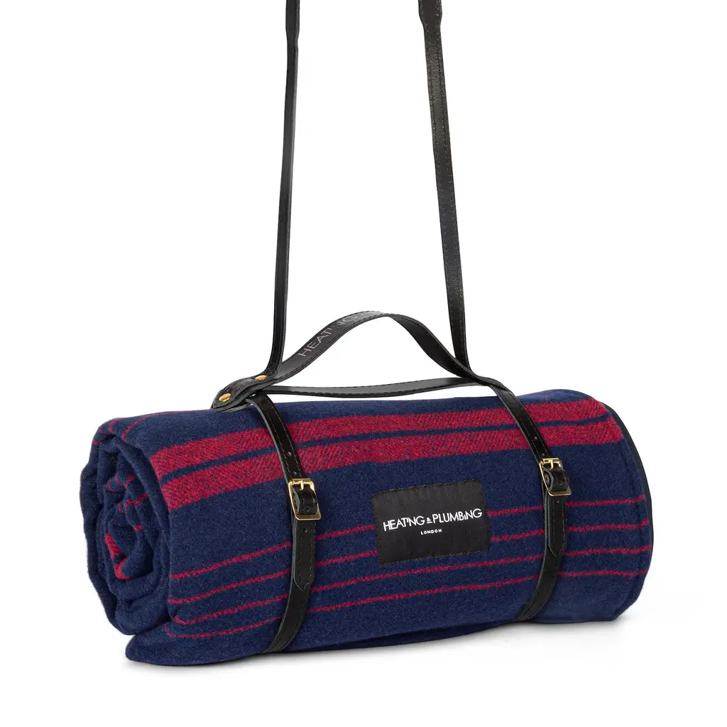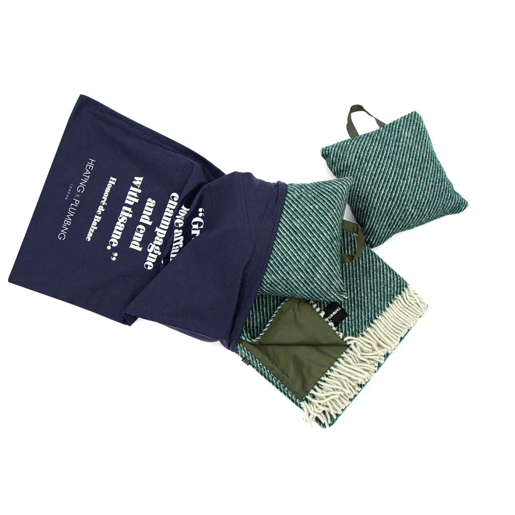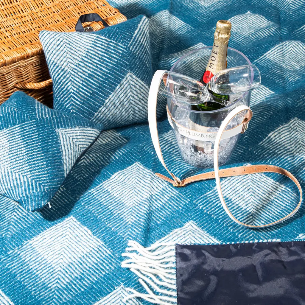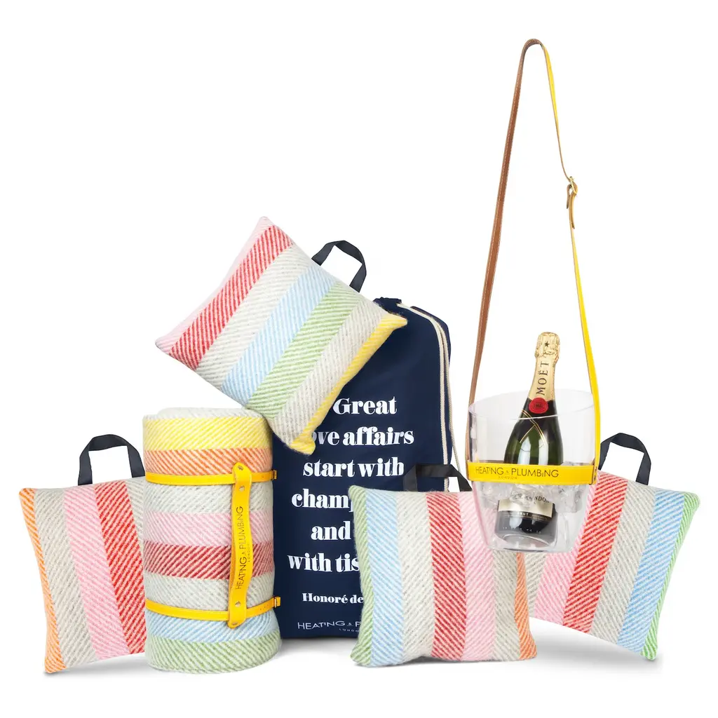 This luxurious picnic set contains one of our Swinging London pure new wool picnic blanket, 2 outdoor cushions and a playful portable Champagne bucket with a matching leather strap. The picnic rug and the cushions have a waterproof backing to add some extra comfort when you are enjoying the great outdoors in the country or in your garden. This outdoor toolkit comes in a smart navy blue cotton storage bag with a brand new design with a wonderful quote about Love & Champagne from Balzac.