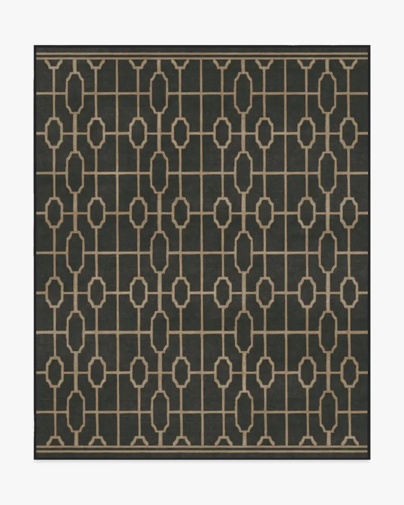 Host like Kathy and Nicky Hilton with The Hiltons Diana Trellis Black & Gold Rug. Featuring delicate linework and curves that repeat in a mesmerizing pattern reminiscent of opulent gold chains, this geometric design symbolizes the enduring connection between mother and daughter. Luxurious gold outlines flow along dark cream chain motifs, all set against a charcoal background for easy elegance. This design is one of our holiday favorites! Water-resistant, stain-resistant, and machine-washable. Rug colors may vary slightly according to your device and the lighting in your space.