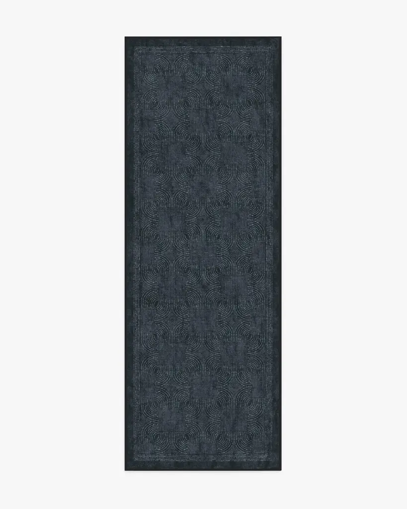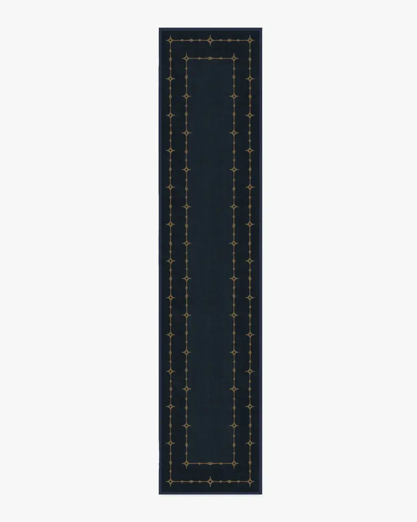Diamonds are a girl's best friend, and so is The Hiltons Montecito Indigo Rug. Featuring hand-drawn linework that meticulously mimics a beaded texture along the motifs, this crafty design utilizes curving lines to form mesmerizing diamonds within the repeating pattern. A thin border delicately frames the intricate, dark blue design, allowing it to shine against a deep indigo background. Water-resistant, stain-resistant, and machine-washable. Rug colors may vary slightly according to your device and the lighting in your space.