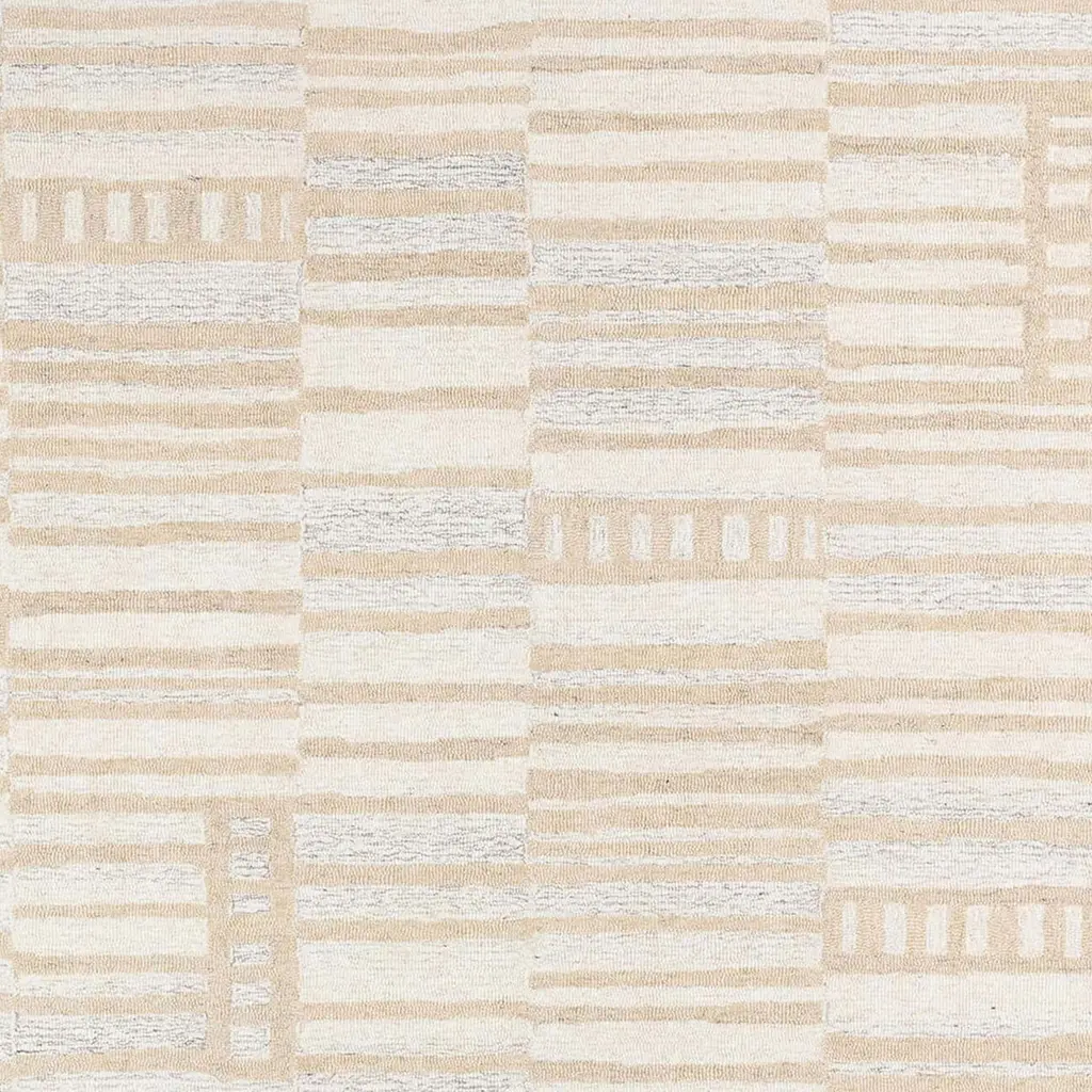 Hand Tufted 100% Wool Made In India The Marina rug offers a playful, geometric pattern in a subdued soft beige and cream color. Hand-tufted wool offers plushness underfoot, while a dynamic pattern of interlocking rectangles creates visual interest. Available in multiple sizes, this versatile piece adds modern sophistication to any space.