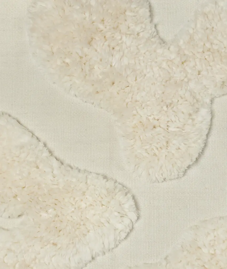 Orca features organically shaped islands of shag that fall over and into our hand woven rug. Orca highlights the playful relationship between depth and perception by incorporating the three dimensional shag shapes into the flat woven base.