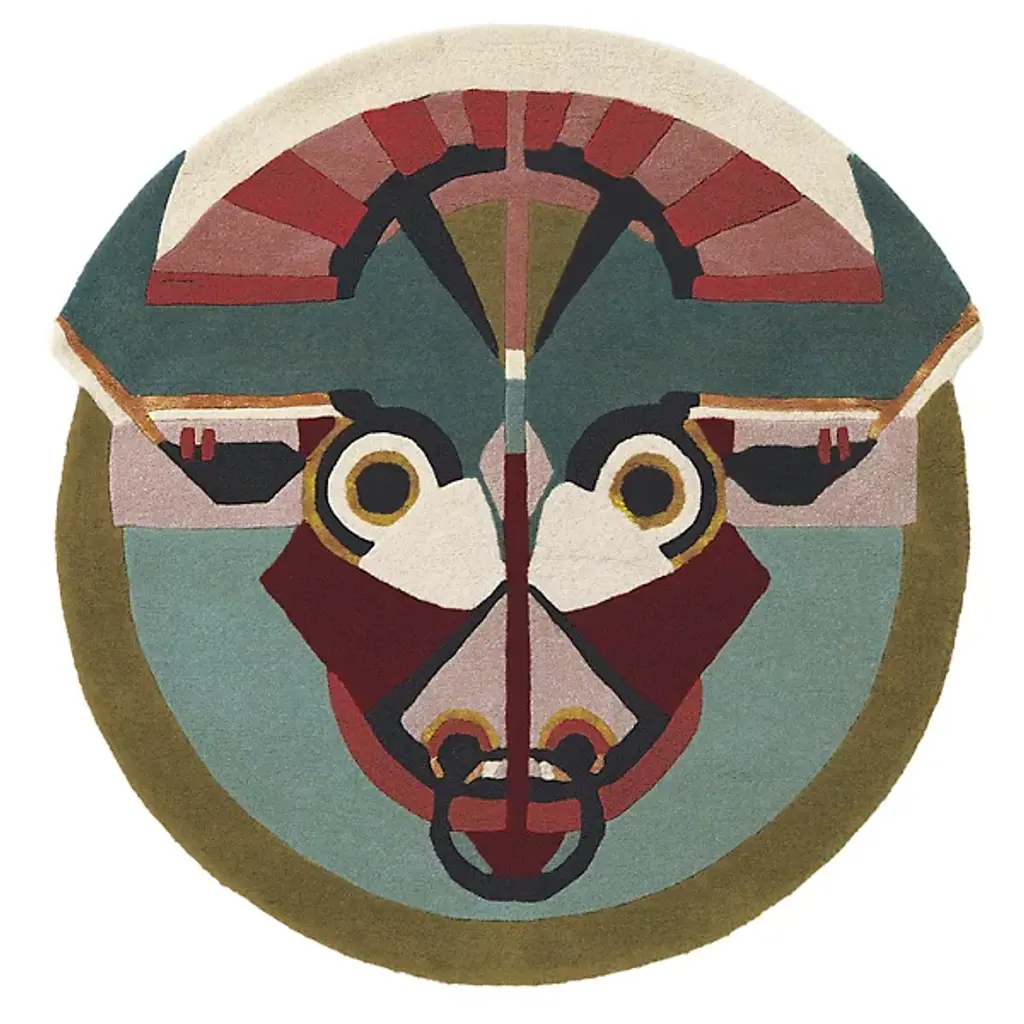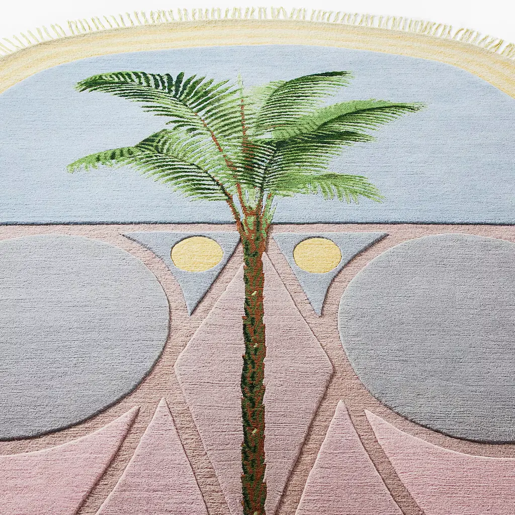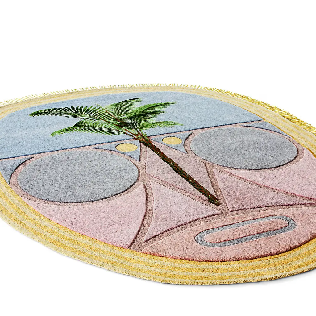 This eclectic wool rug designed by Formafantasma in 2014 breaks with design canon in rug-making. The egg-shaped profile features an anthropomorphic likeness with two circles for eyes, an oblong oval mouth, triangles along the mouth, a realistic palm tree spanning the length of the nose, and fringe along the top half to mimic hair. Hand-knotted in Nepal, this exclusive rug is part of a 10-piece limited edition and has 150 knots per inch with a variable pile height of 4/6/8/10 mm. Customizable size on request.