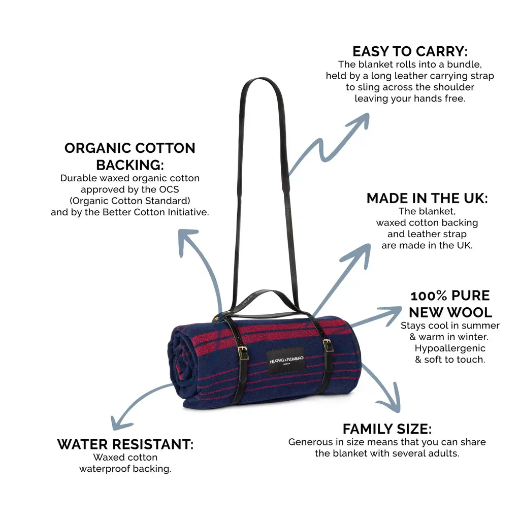 A call for the outdoor is also a call to protect our environment. The Wool & Wax Edition, our new picnic blanket design is layered with a waxed cotton waterproof backing. With a longer strap (to sling across the shoulder leaving you hands-free) than our classic pure new wool picnic blanket, each rug is large enough and ideal for several adults but rolls up into an easy-to-carry bundle. The slim elegant strap adds a touch of style to the overall look. The soft top layer made of pure new wool is gloriously comfortable to sit on and protected from the dampness in the ground by the waxed cotton layer.The Wool & Wax Edition is our most eco-friendly picnic blanket so far and a gorgeous smart picnic accessory with beautiful British Heritage.