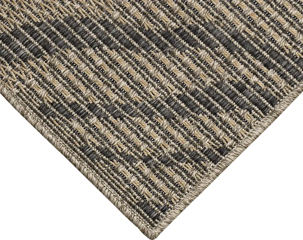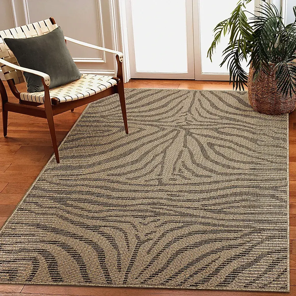 The Thebe jungle animal transitional flatweave area rug features a neutral background with grey tweed zebra stripes creating a visually interesting geometric pattern. Vacuum regularly. Sponge spots to clean. To clean full rug, gently rinse with a solution of mild detergent and water, then hose rug clean. Reducing exposure to rain and moisture will prolong rug life. Use of a rug pad is recommended.