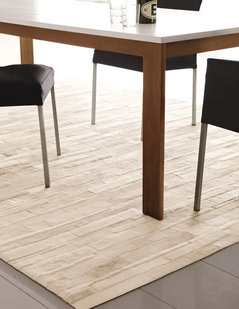 The Thin Strip Cowhide Rug is a neutral area rug that complements a modern aesthetic with its interesting patchwork effect and soft texture. It's produced by carefully sewing varied individual strips of hide together with thick polyester threading, resulting in a durable piece that stands up to foot traffic. Each is unique, with its own distinct markings. Can be washed with mild soap and water and swept or vacuumed clean. Slight color variances may be seen throughout the rug. Made in Argentina.