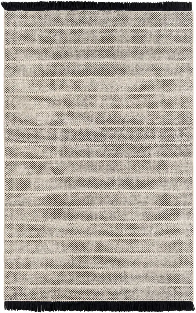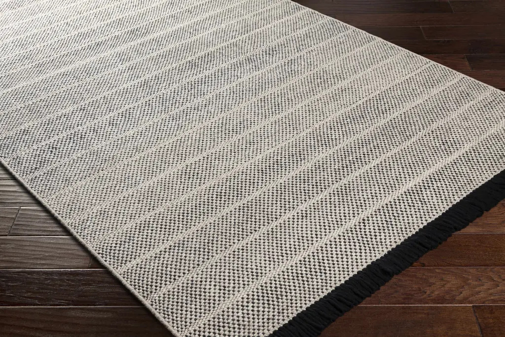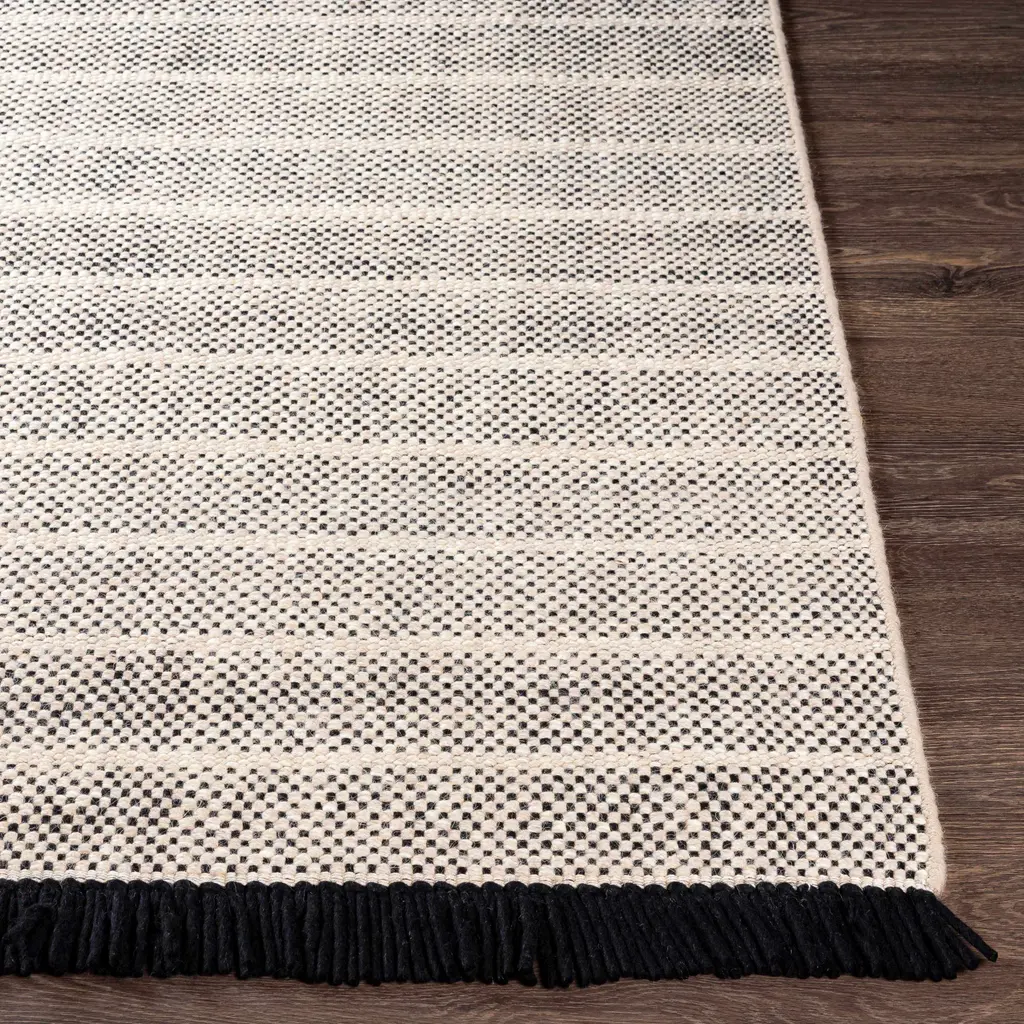 Collection: Thorold Colors: Beige, Black Construction: Hand Woven Material: 100% Wool Pile: No Pile Styles: Transitional,Traditional Made In: India Thickness: 0.5" Fringe Length: 3" Price Range: $$$$$ (Affordable)