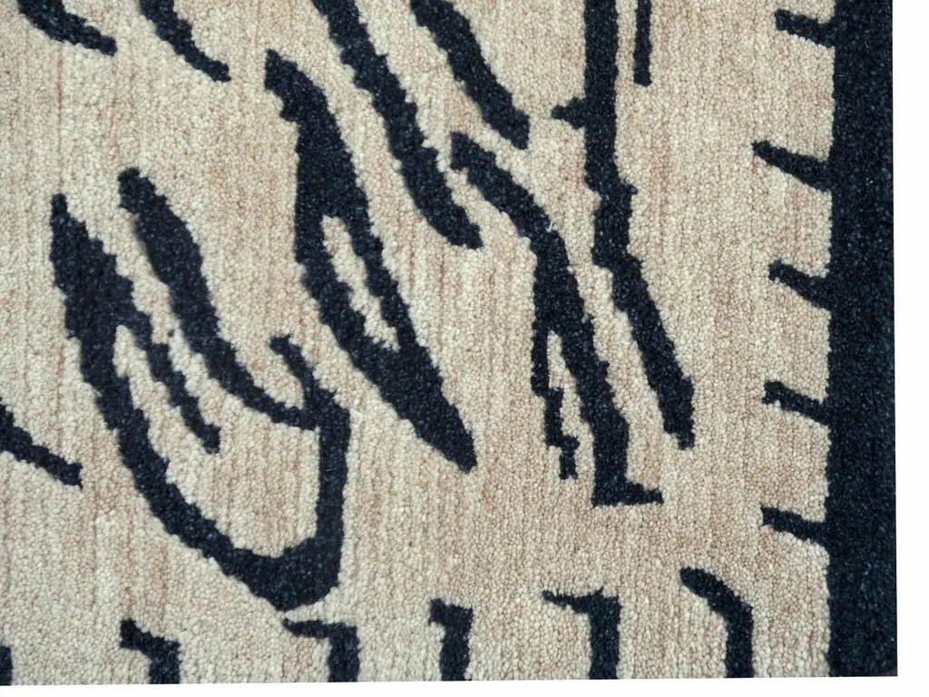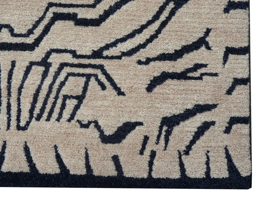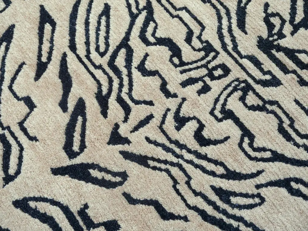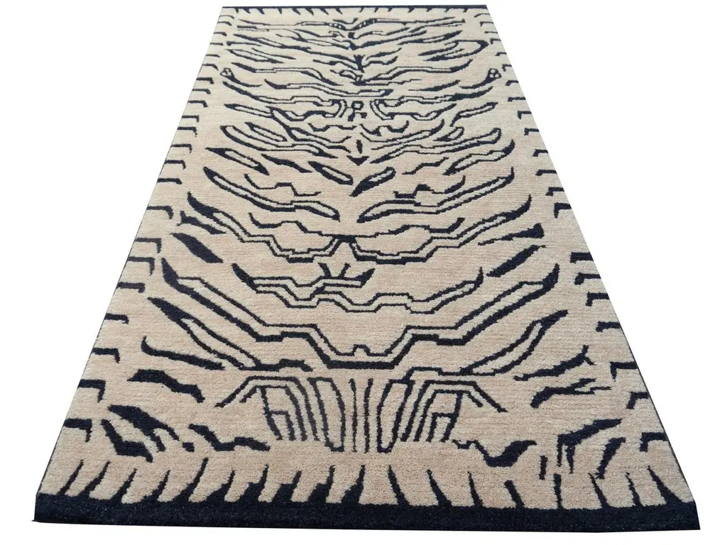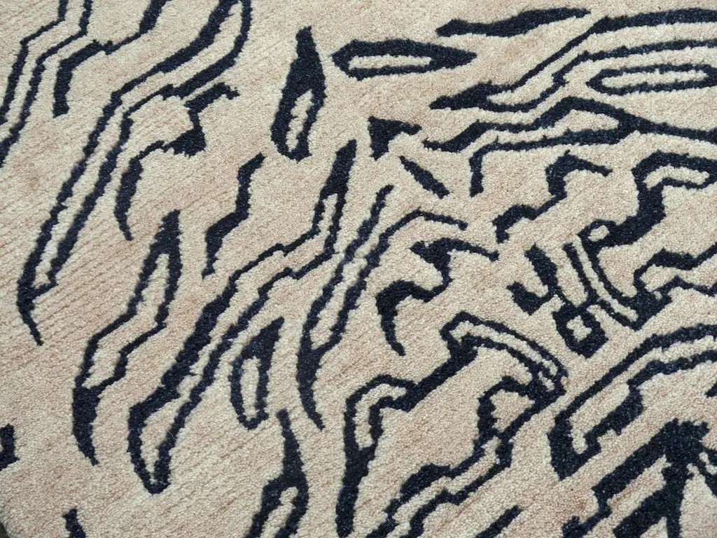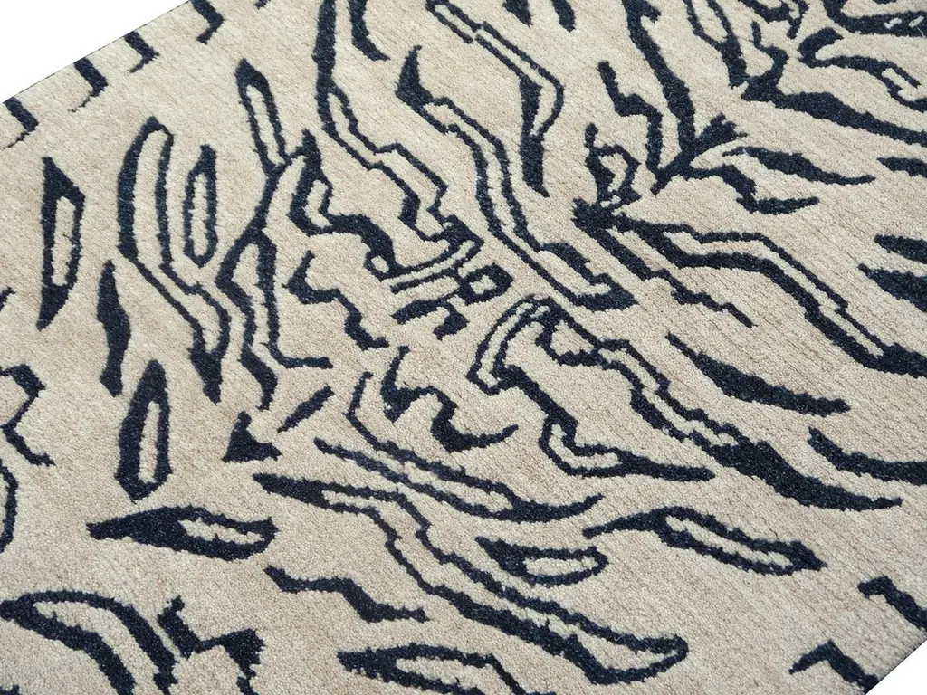 A Japandi Tibetan Tiger rug, hand knotted in Nepal.This traditional Tiger rug design is typically found on antique rugs called Khaden. It describes a small sized rug of about 3 x 6 ft that was used in Tibet to decorate columns or seat pad. Often these Khaden rugs had Lotus design or Tiger stripes.Our collection of Tibetan Tiger rugs is made in different material combinations. The displayed rug is made of 100% Tibetan hand spun wool. Total pile height about 1/2 inch, Knot density 60 Tibetan knots per square inch. It has a beige background color and motifs in charcole with a little touch of indigo which gives it a blue shimmer. This rug has a fantastic feel, very soft and smooth. We can produce this design in sizes up to 20 x 16 ft on order. Other color combinations are possible. Goes great with Art Deco or Hollywood Regency interior design, but will be an eye catcher in any room, no matter if it is a living room, dining room or bedroom. Interior designers welcome.Very fine wool and quality. Current production by Djoharian Design Collection, other sizes can be made on order.The Djoharian Design Collection is located in Germany, all our rugs are shipped from there. We are licensed FAIR-TRADE partner of LABEL STEP FAIR TRADE CARPETS. Label STEP is the fair-trade non-profit organization committed to the wellbeing of weavers and workers in the handmade carpet industry.