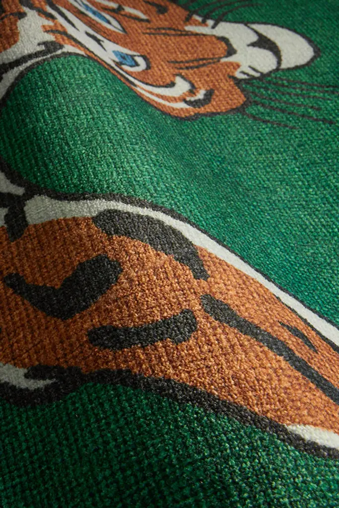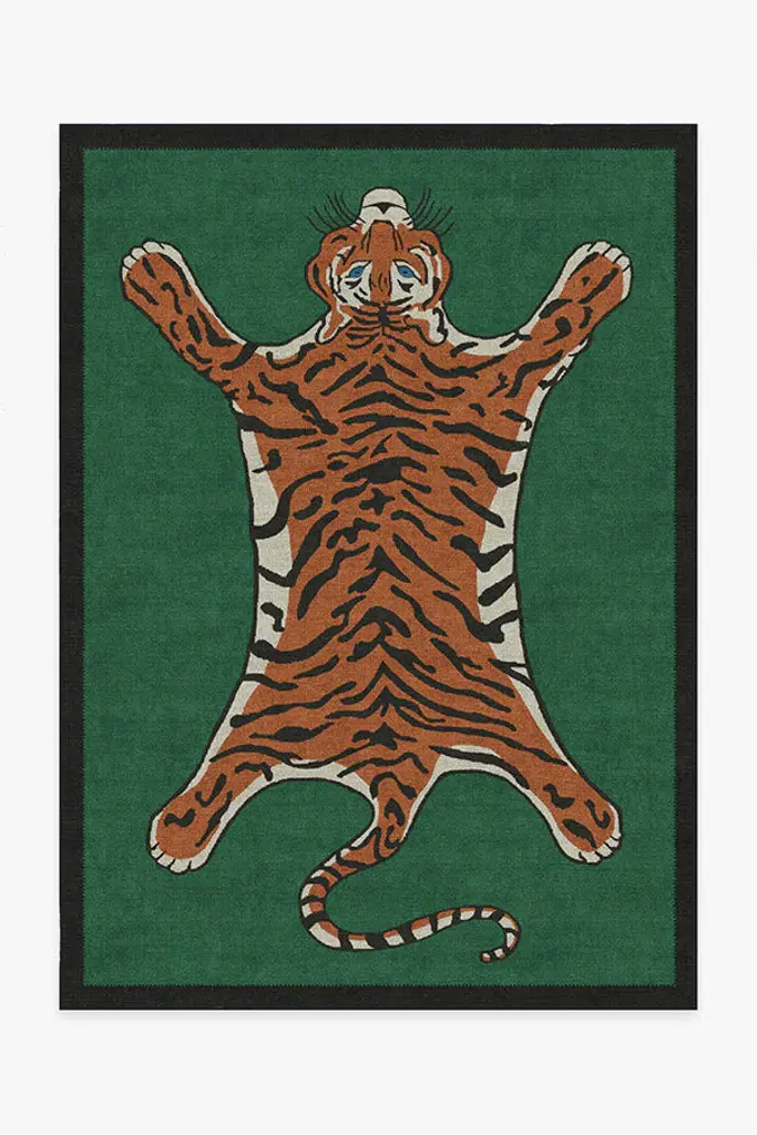 Wild cat chicness. Our Jonathan Adler Tiger Emerald Rug features an orange, cream, and black tiger sprawled across a rich emerald green background with a needlepoint texture across the design. Water-resistant, stain-resistant, and machine-washable. Rug colors may vary slightly according to your device and the lighting in your space.