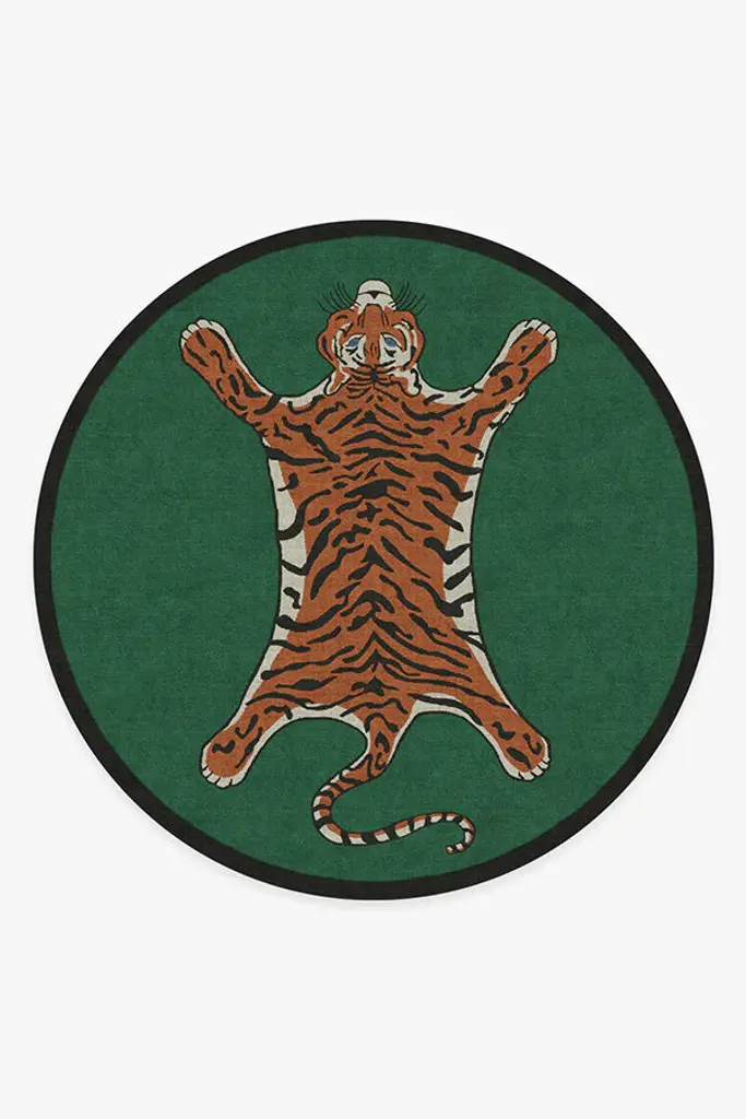 Wild cat chicness. Our Jonathan Adler Tiger Emerald Rug features an orange, cream, and black tiger sprawled across a rich emerald green background with a needlepoint texture across the design. Water-resistant, stain-resistant, and machine-washable. Rug colors may vary slightly according to your device and the lighting in your space.