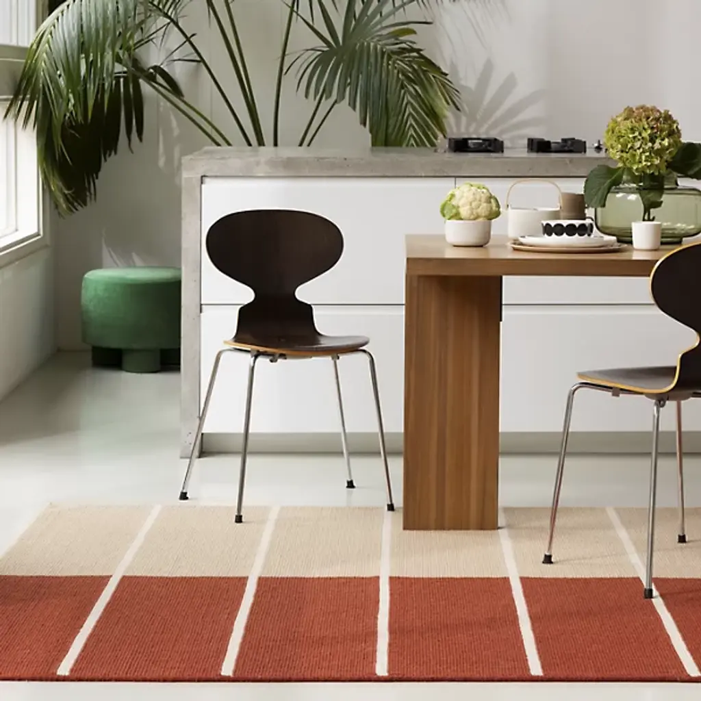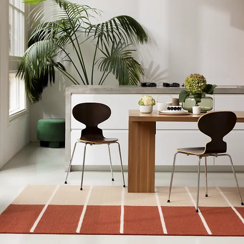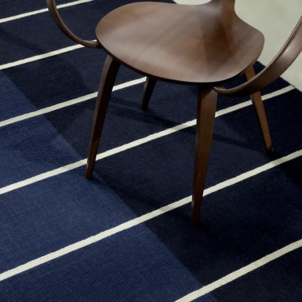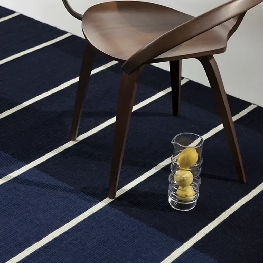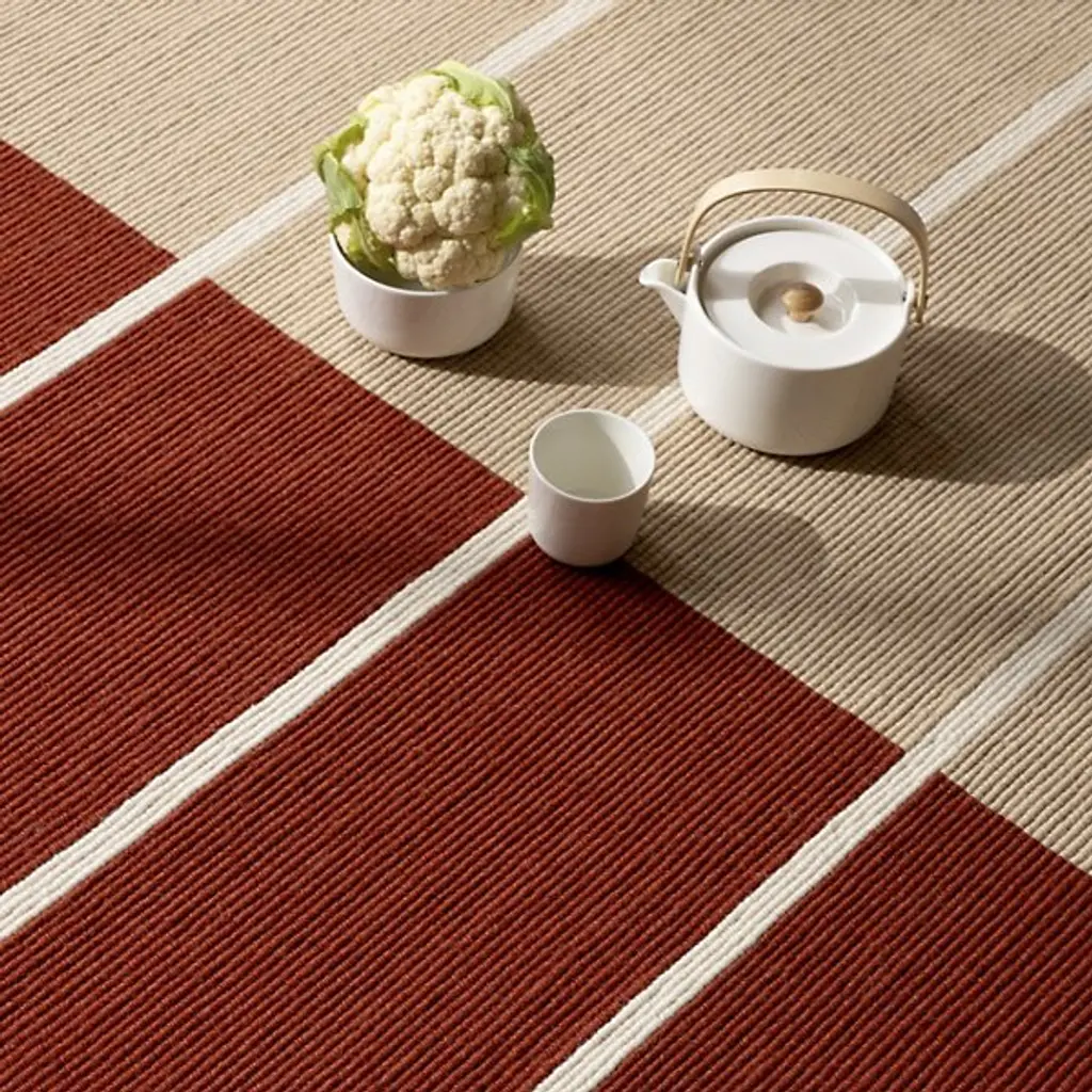 The Tiibet Area Rug from Marimekko stands proud as Vuokko Eskolin-Nurmesniemi’s debut graphic print for the Marimekko brand, creating a calm, open space. Reminiscent of a quiet, broad landscape, the design features bold bars intersected by fine, pale lines, creating a strong visual rhythm. Each rug is made by hand in India from pure New Zealand wool, creating a soft, textured surface underfoot, a grounded composition that combines comfort with enduring artistic depth.