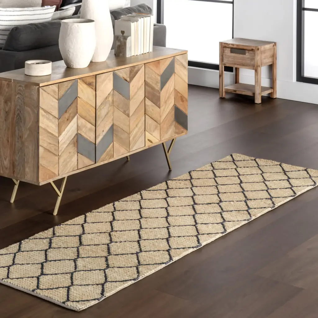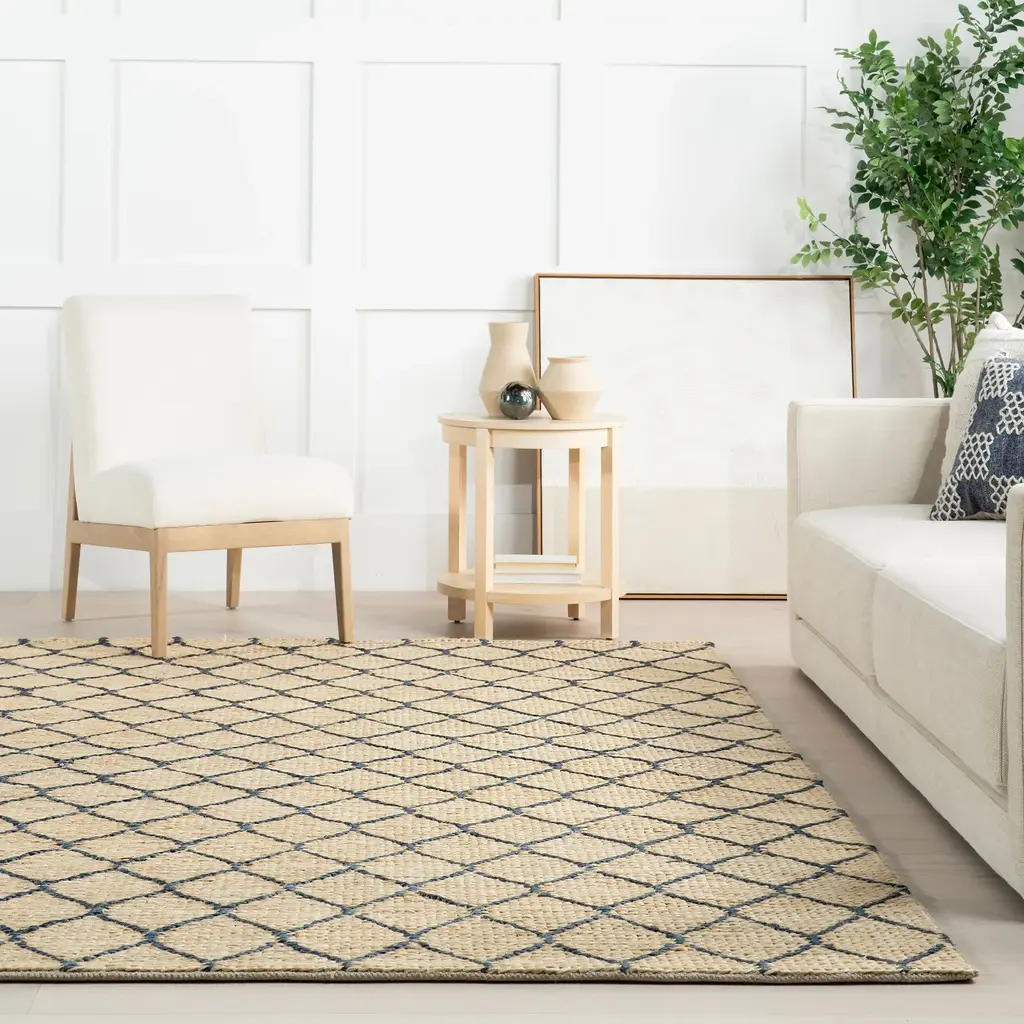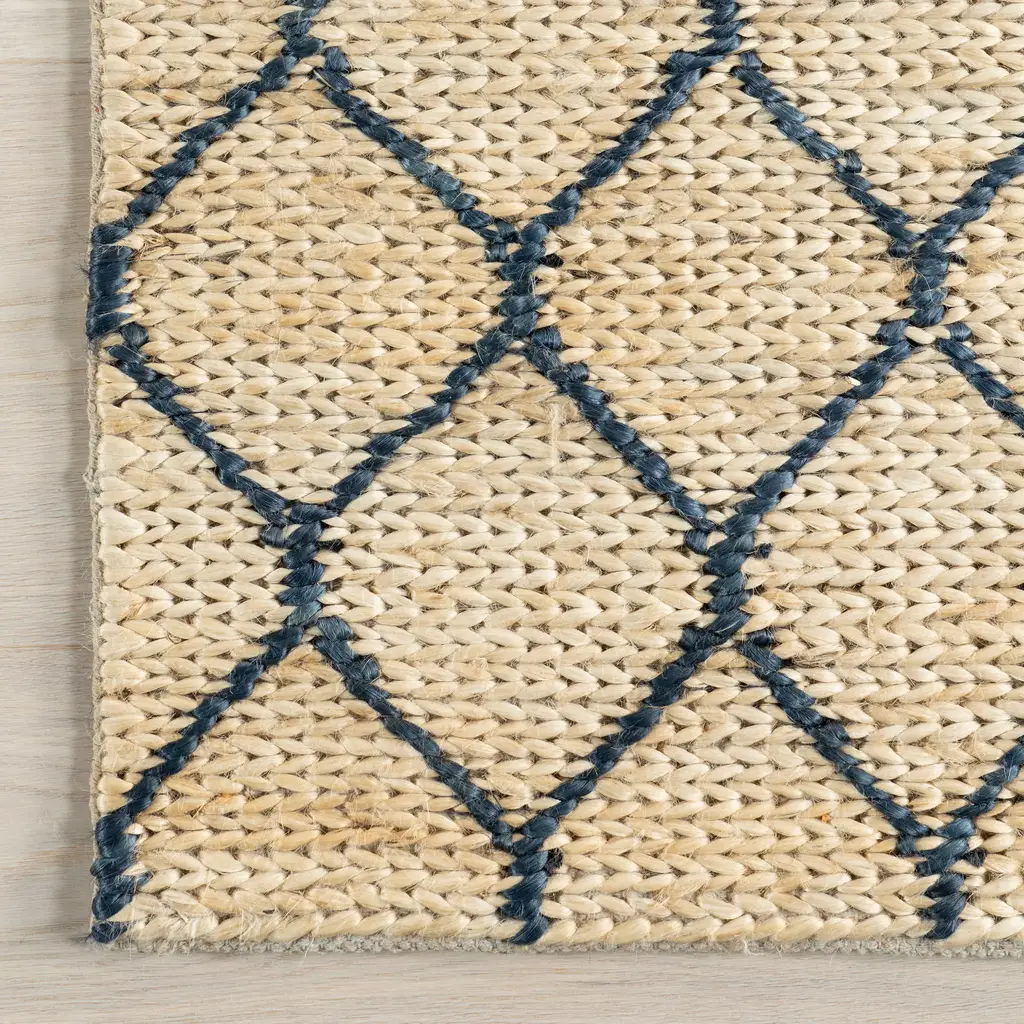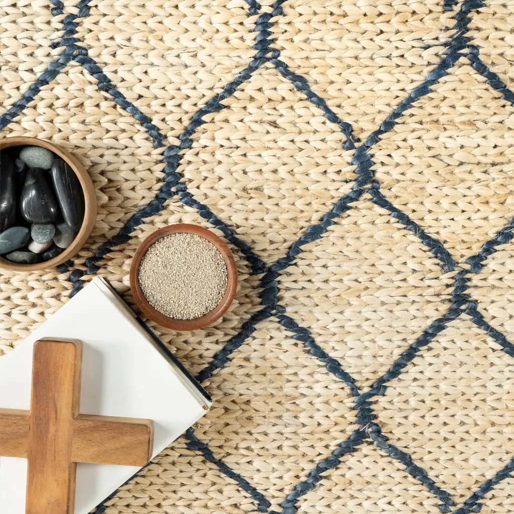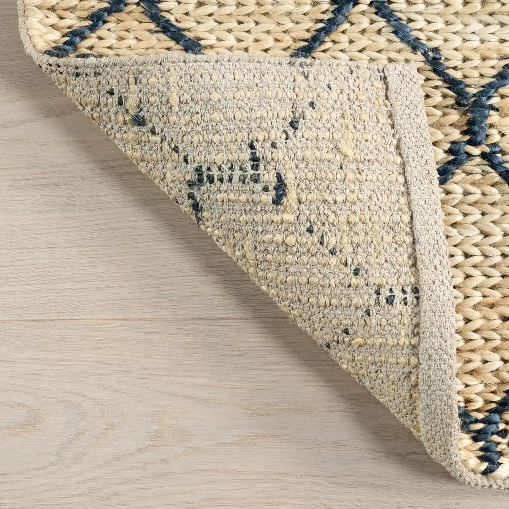 Overlaid on a braided weave of natural jute, a simple lattice pattern resembles tilework and mixes with any aesthetic. Hardworking and handsome, the color and design of this gently cushioning rug will make a room feel welcoming and alive. Handwoven using a natural plant fiber that is sustainably grown and known for its smoothness and strength.