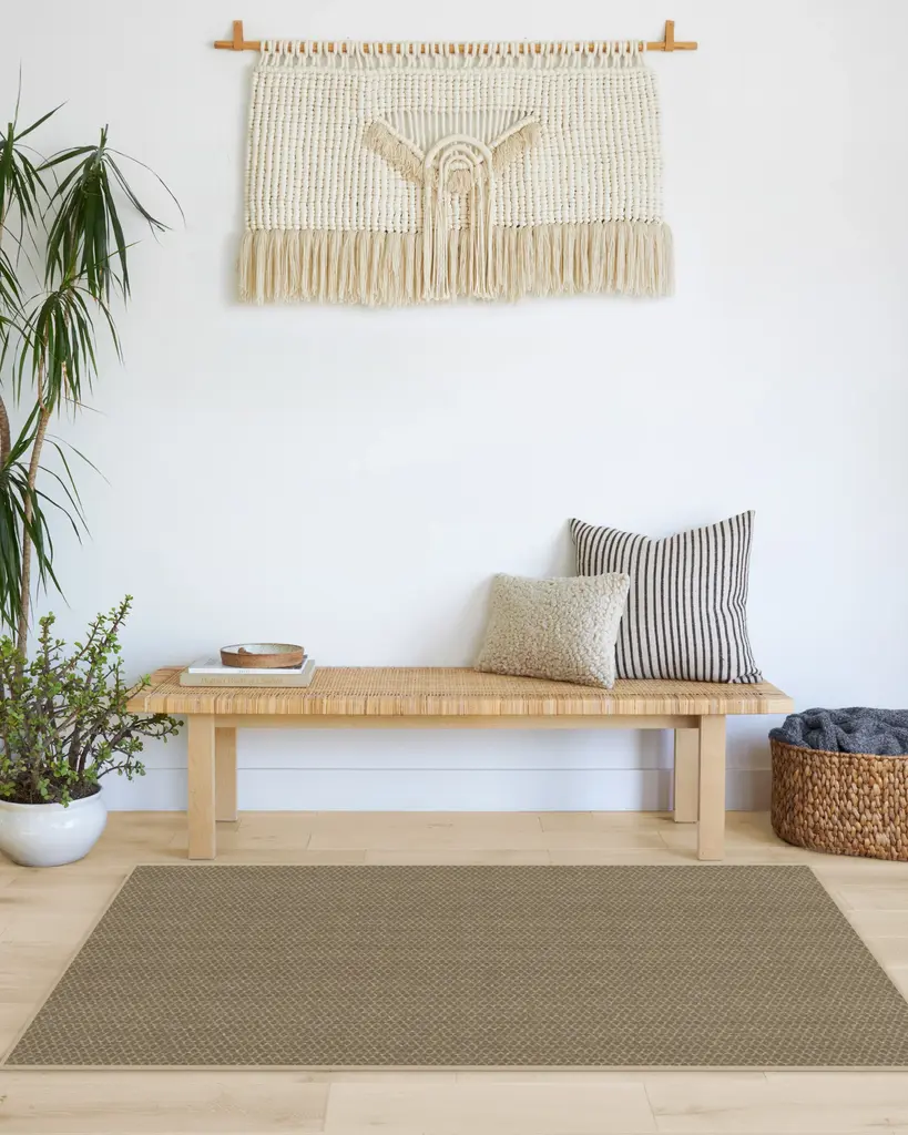 For those who like their rugs simple and versatile. This rug's solid design features delightful tiny, sand-colored diamond tiles, giving it depth and texture. Its natural color and washable jute-like material make it a place-anywhere rug. Made with recycled + virgin polyester, and polyurethane.
