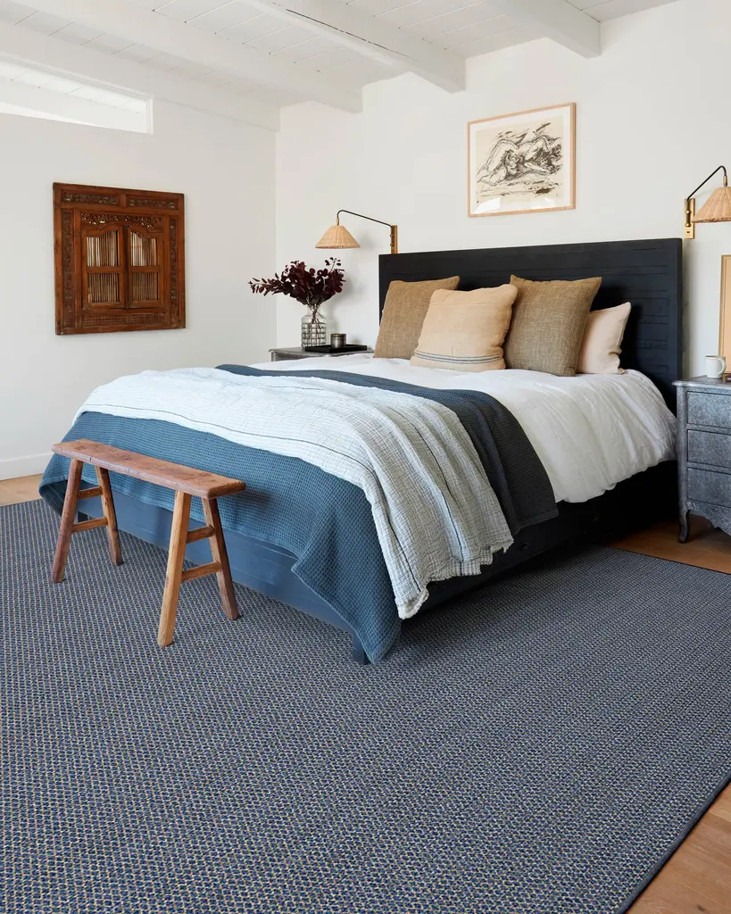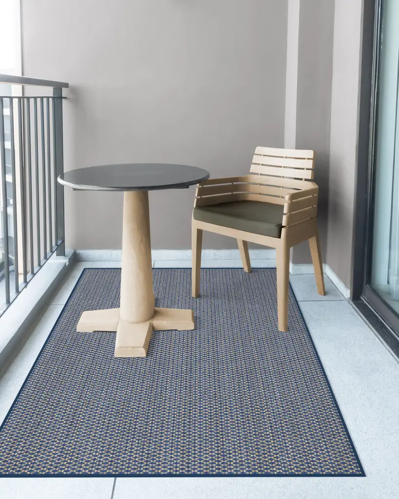 This blue is anything but boring. This navy blue rug features a pattern of small diamond tiles, giving it a solid color with lots of textures. It is made with a washable jute-like material that makes it easy to clean. Made with recycled + virgin polyester, and polyurethane.