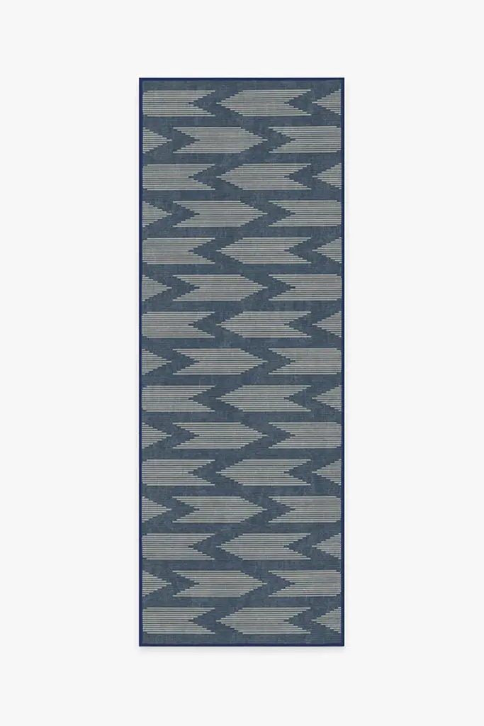 This blue is anything but boring. This navy blue rug features a pattern of small diamond tiles, giving it a solid color with lots of textures. It is made with a washable jute-like material that makes it easy to clean. Made with recycled + virgin polyester, and polyurethane.