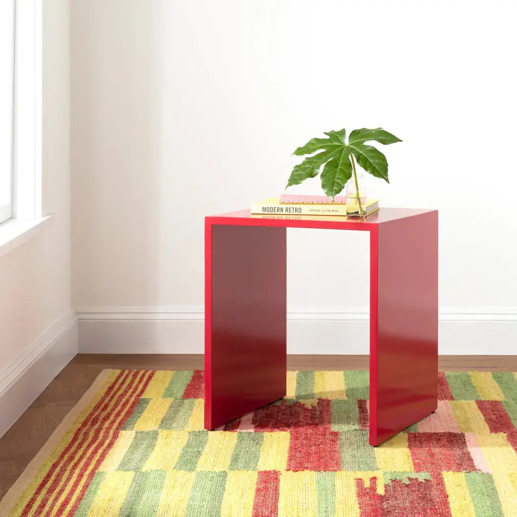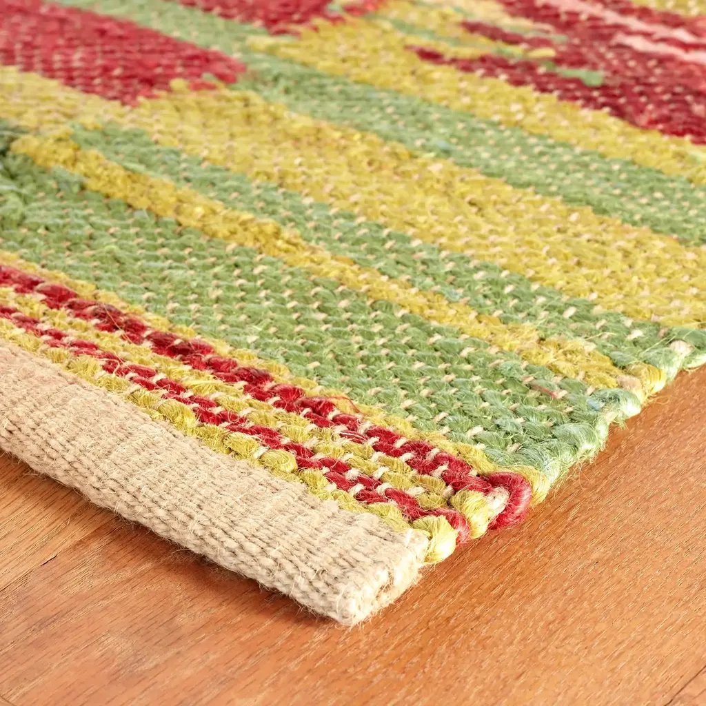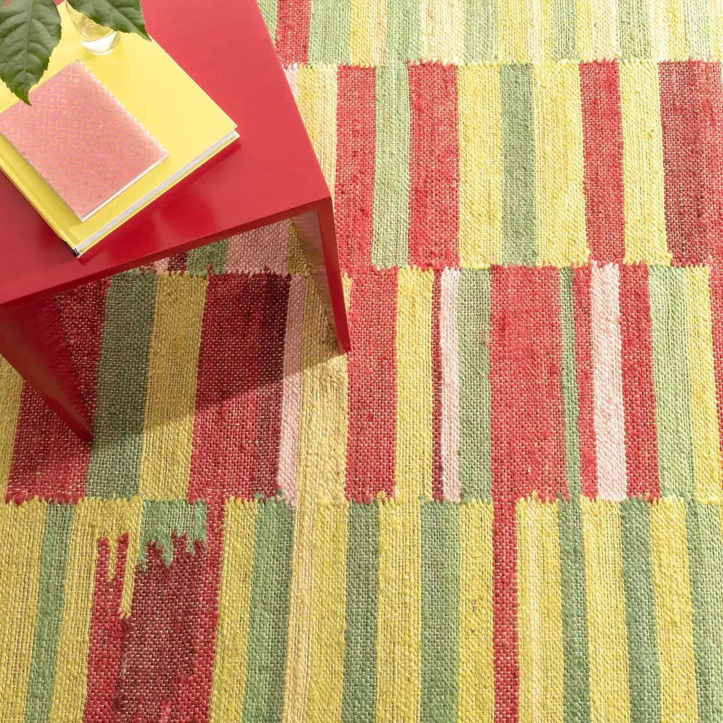 Kit Kemp, co-owner and Creative Director for Firmdale Hotels, is committed to the humanity of craft processes and maintaining the mark of the human hand in the environments she designs. This flatwoven jute rug is an eye-popping fusion of lush, verdant shades of Green Sprout, Leaf with fiery pops of Crimson, Scarlet, Coral and Gold. Inspired by the narrow strips from traditional backstrap loom weaving, which are traditionally pieced together to create random ladder stripes, this timeless creation evolved from the design collaboration between Annie and Kit, united by their passion for colorful and carefree design, redefining traditional forms of craft for modern life.