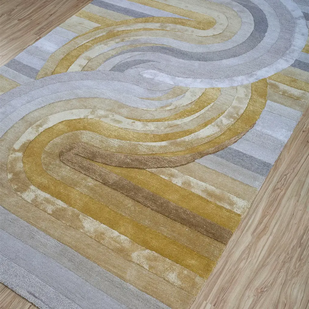 This hand-tufted rug features a contemporary palette of gold and white, infusing any room with dynamic energy. Its groovy geometric patterns and bold hues add playfulness and sophistication, making it ideal for modern, eclectic, or bohemian-inspired interiors. Crafted in India from premium wool, it offers both durability and a plush texture underfoot. Available in various colors, shapes, and sizes, this exclusive design can also be customized to fit any space and style.