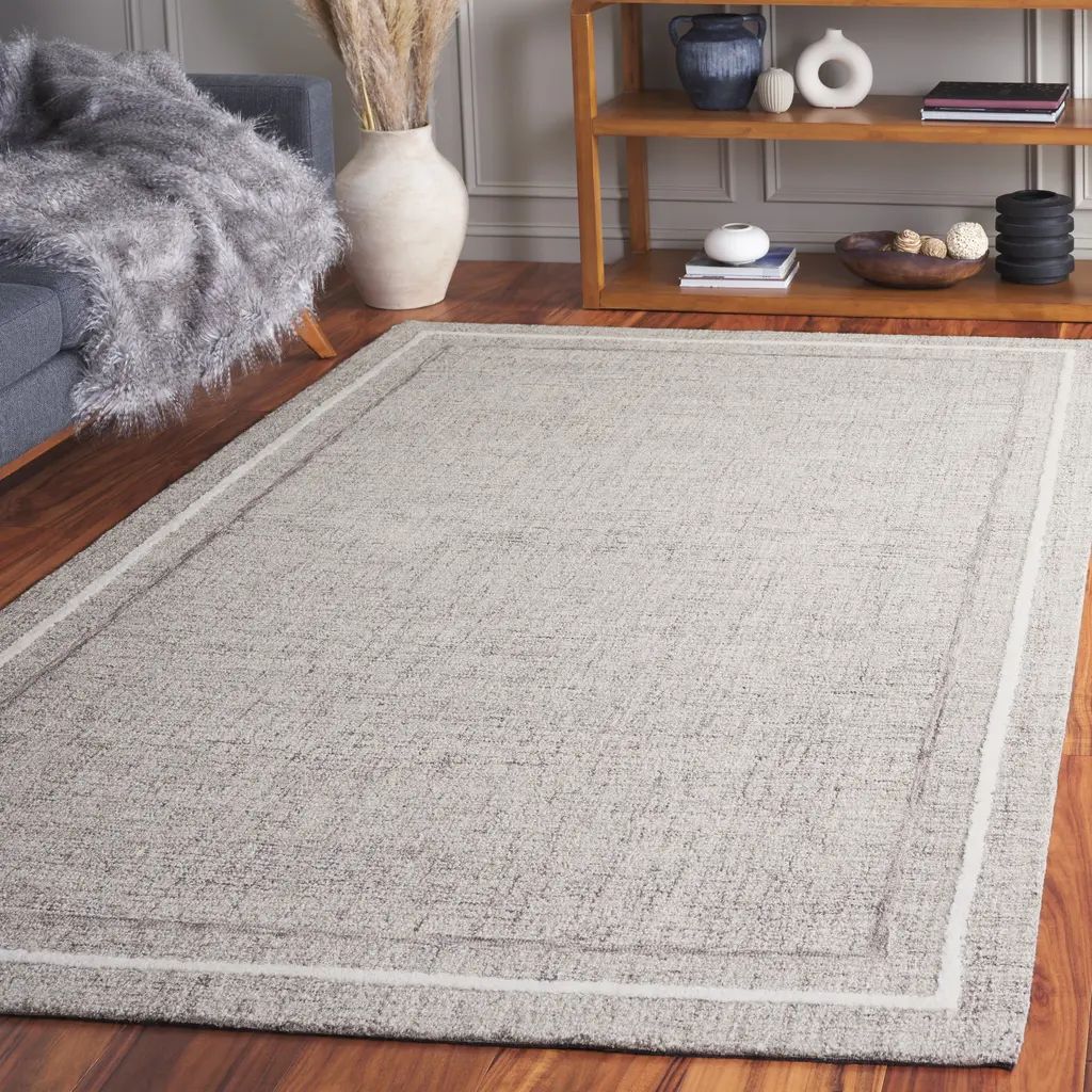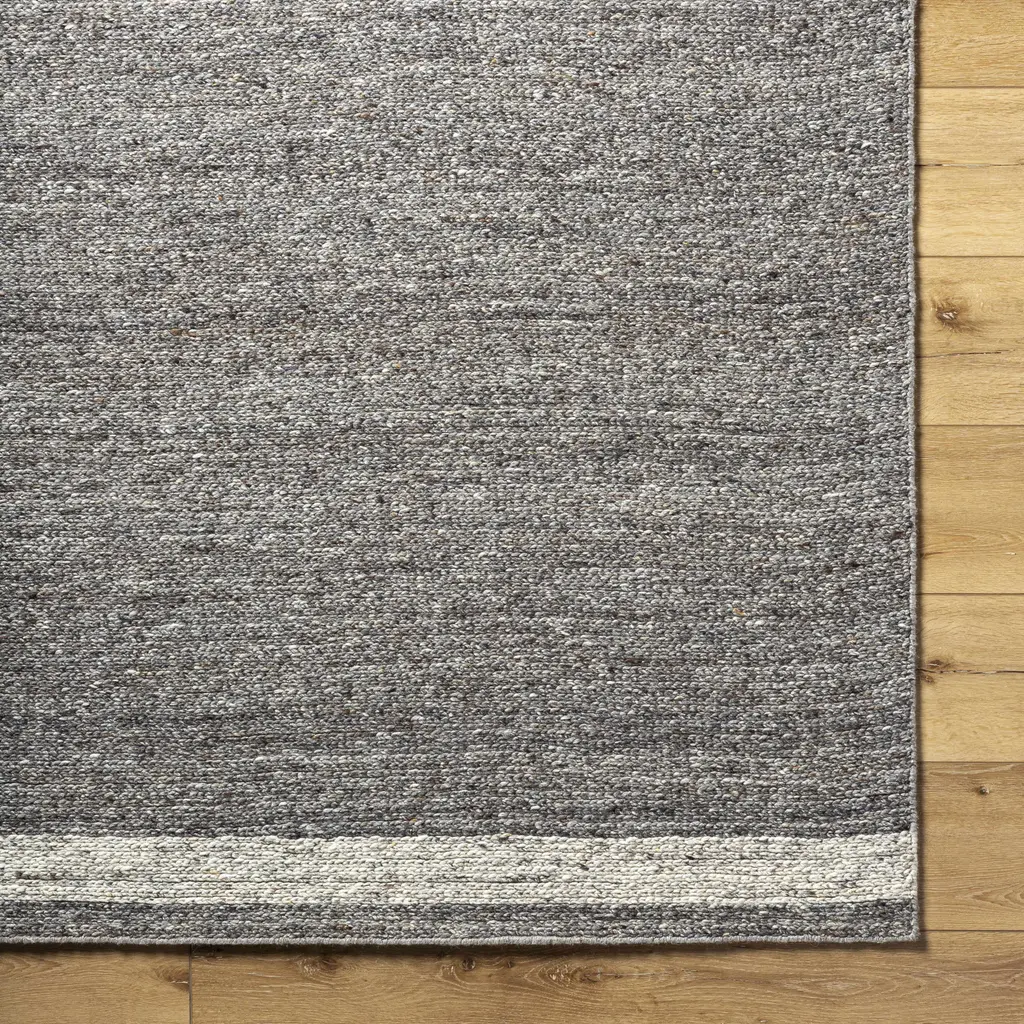 Collection: Tiran Colors: Gray, Medium Gray Construction: Hand Tufted Material: 100% Wool Pile: Low Pile Pile Height: 0.2" Styles: Transitional,Traditional Backing: Canvas Made In: India Thickness: 0.43" Price Range: $$$$$ (Affordable)