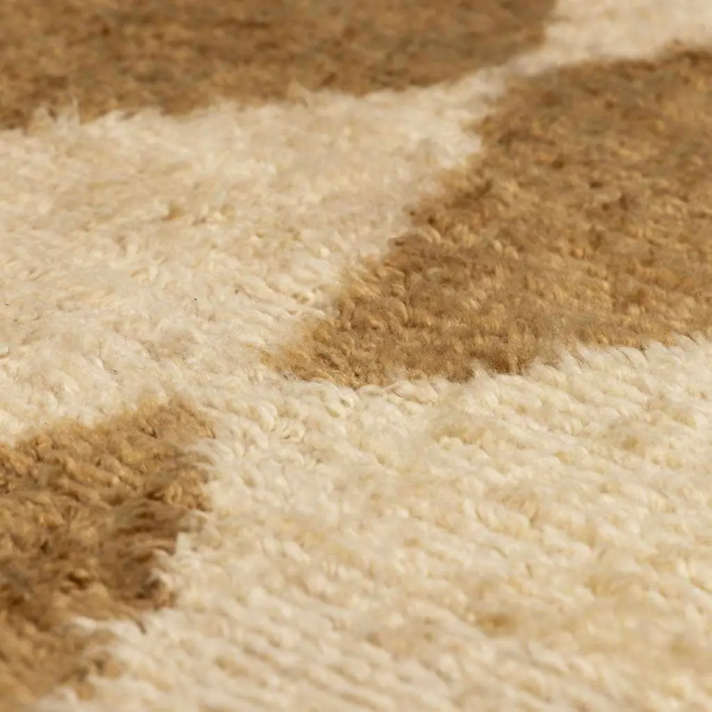 Collection: Tivka Colors: Light Brown, Beige Construction: Hand Tufted Material: 100% Wool Pile: High Pile Pile Height: 0.98" Styles: Transitional,Bohemian Backing: Canvas Made In: India Thickness: 1.76" Price Range: $$$$$ (Affordable)