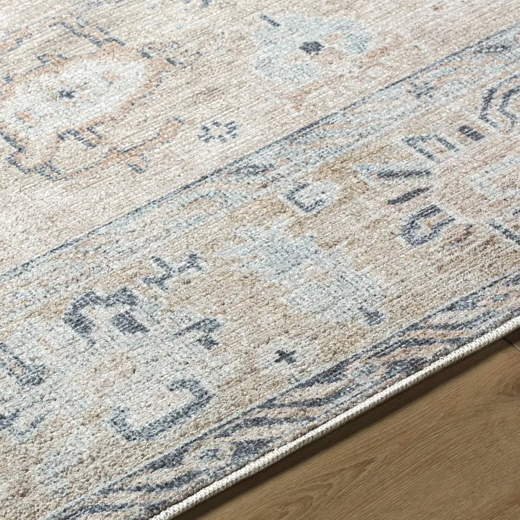 Collection: Toddy Colors: LightBeige, Tan, Charcoal, Slate Blue, Mauve Construction: Machine Woven Material: 100% Polyester Pile: Medium Pile Pile Height: 0.31" Styles: Traditional Made In: Turkey Thickness: 0.39" Price Range: $$$$$ (Affordable)