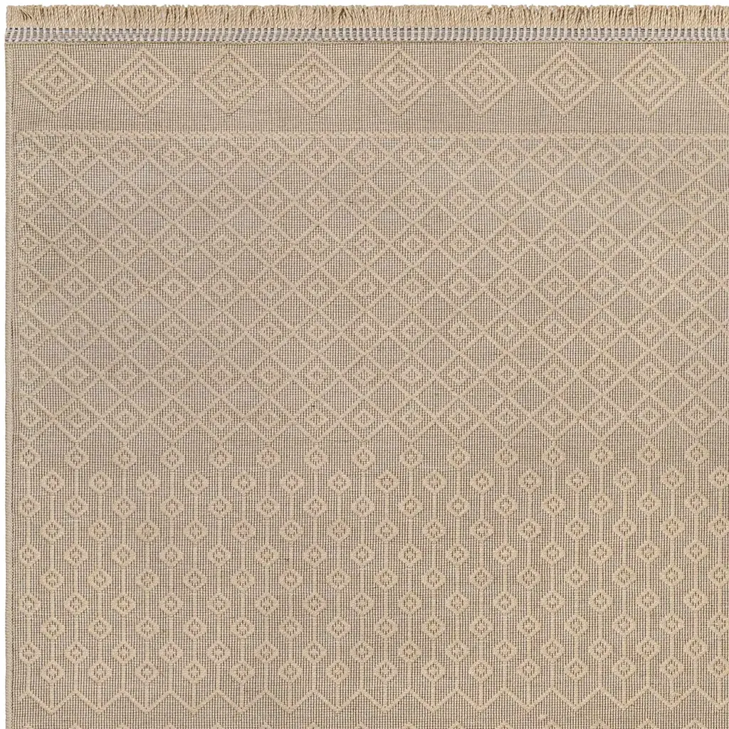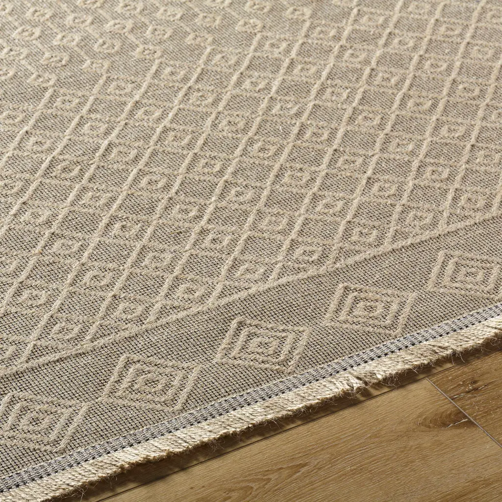 Collection: Tolla Colors: Tan, Beige Construction: Machine Woven Material: 100% Jute Pile: Low Pile Pile Height: 0.02" Styles: Transitional,Traditional Machine Washable: Yes Made In: Turkey Thickness: 0.2" Fringe Length: 1.18" Price Range: $$$$$ (Most Affordable)