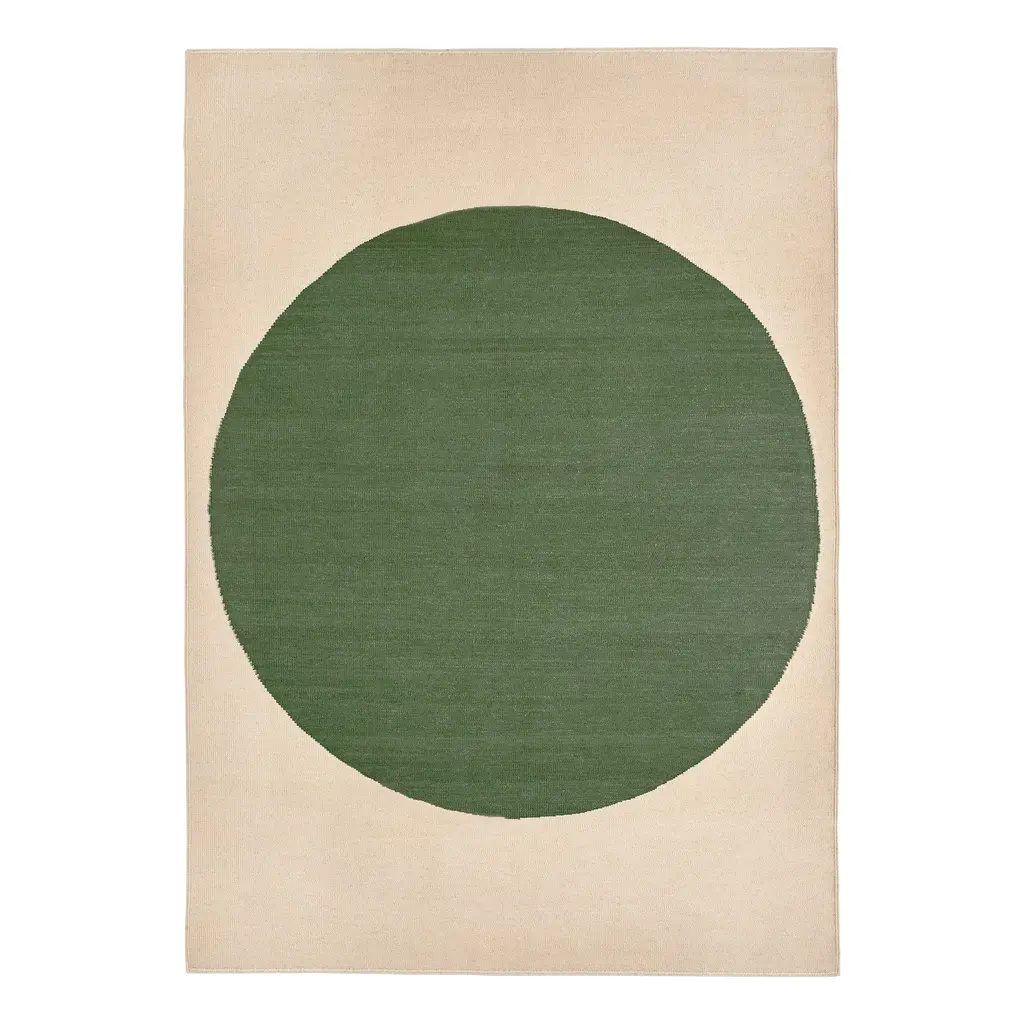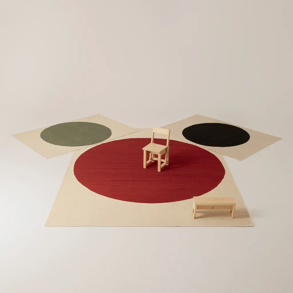 The Topo Rug from Nanimarquina redefines functional design by embracing simplicity and striking visual contrast. Featuring a large circle delicately placed at the edge of a rectangular field, this handwoven kilim blends traditional Afghan handspun wool craftsmanship with a modern, minimalist aesthetic. Available in monochromatic black, green, or red hues set against a natural raw background, the Topo Rug adds a refined, artistic statement to any space while honoring timeless textile heritage. Highlights