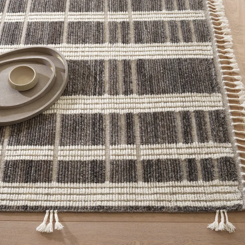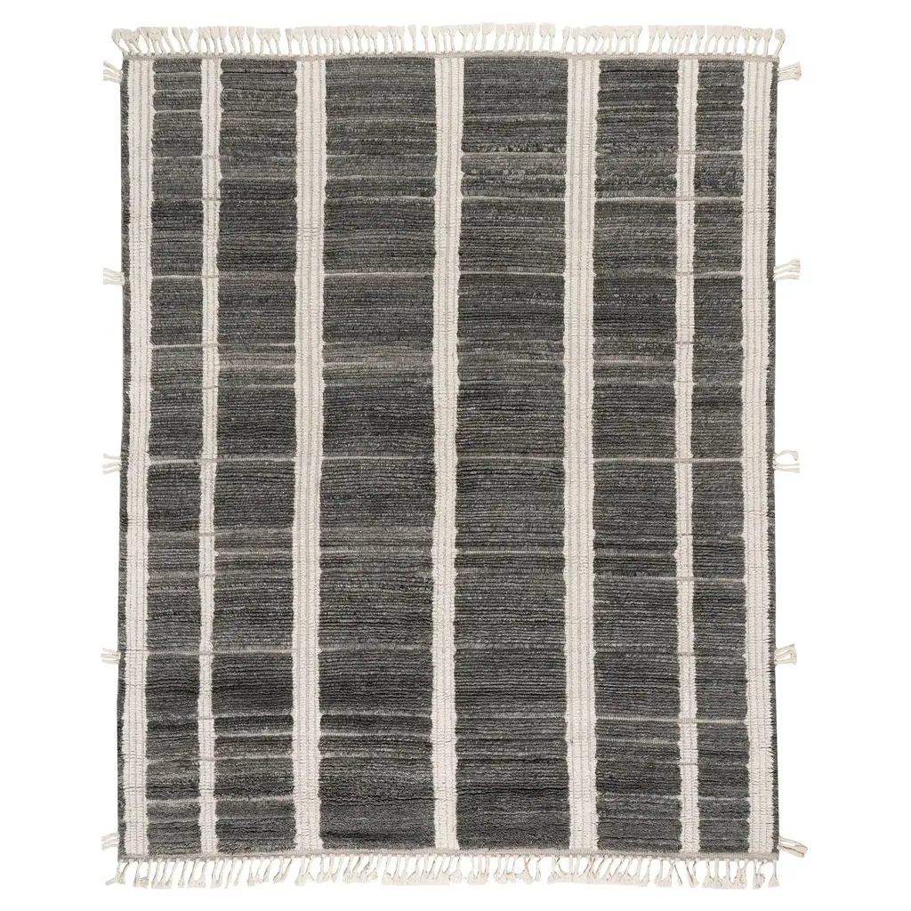 Designed by award-winning interior designer Marie Flanigan, the Tory Pewter Blue Hand Knotted Wool Rug showcases ivory and pewter blue stripes in a plush high-low weave, bringing rich texture and dimension to your floors. Soft underfoot and accented with bohemian braided tassels, it's both comfortable and visually striking. Perfect for living rooms or bedrooms, this rug adds character and style while keeping things cozy.