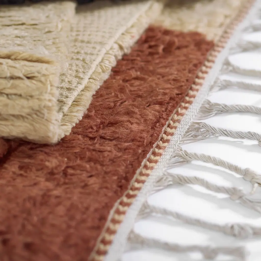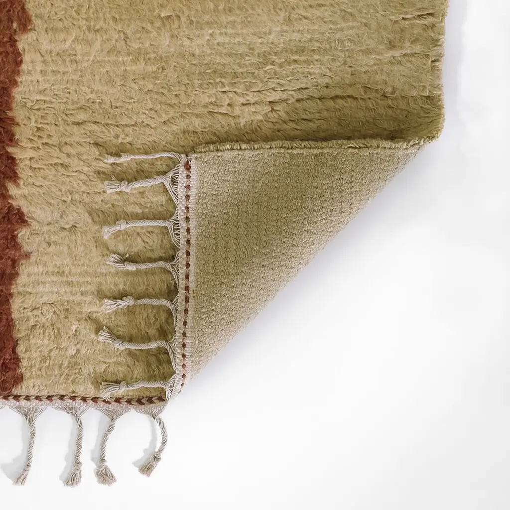 Beautiful hand woven thick shag rugs made from 100% New Zealand wool, using mill spun yarns. Made in India, the yarn is locally dyed in the traditional Vat Dying method. Before the first wash, the back of each rug is mildly burnt with hand-held flame emitting stoves. The rugs are given two rounds of rigorous washing, to provide the softest comfort underfoot. The finishing process includes hand shearing, with a unique and exaggerated one sided tassel fringe. Each tassel is twisted and rolled by hand into bunches with a knot tied at each end, for a unique hand-crafted appeal.